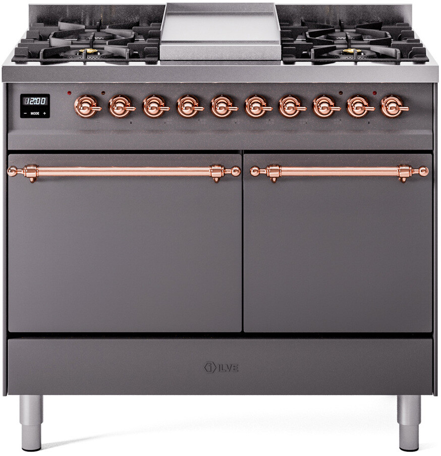 Freestanding Dual Fuel Range with 6 Sealed Burners, 4.3 cu. ft. Total Capacity, Storage Drawer, and Griddle: Graphite Matte, Copper Trim, Solid Door. Enjoy a range of cooking options with six sealed burners, offering precise heat control for any recipe. With 4.3 cubic feet of oven space, you can easily prepare meals of all sizes, from weeknight dinners to holiday feasts. Keep your kitchen essentials organized and close at hand with the convenient storage drawer. Expand your cooking repertoire with the built-in griddle, perfect for making breakfast favorites and grilled sandwiches. With power up to 25000 btu as standard. Optimal supply and perfect distribution of the heat, for all types of cooking. With non-stick nanotechnological treatment. The noble technical characteristics of brass are enriched with a nanotechnological coating that assures easy cleaning, with an elegant Total Black finish. Structure in AISI 304 steel with 12/10 thickness, option to choose the ideal combination between a gas hob with up to 9 burners or induction, mixed and in various setups. The indestructible cast iron pan supports provide a functional and safe support for the pots. The electronic control ensures that the temperature of the oven remains constant throughout, without fluctuating, as is the case in conventional ovens. It can be set with precision starting from 85F, for perfect proofing, up to 575F, for roasting. The door hinges are fitted with a shock absorber that makes the closure more gradual and noiseless. The quick oven preheating function allows it to reach the desired temperature in a short time and you can then choose the best-suited cooking mode for the dish. It also works as rapid defrosting when a low temperature is set (85F 105F). The grease does not stick to the surface and can therefore be cleaned more easily. Pizza function. Quick start. Multiple fan cooking. Intensive cooking. Fan grill cooking. Grill cooking with closed-door. Cooking from above. Cooking from below. Static normal cooking. Grill cooking with closed-door. Cooking from above. Cooking from below. Static normal cooking. Series: Nostalgie II. Noblesse Frames: No. Fuel Type: Dual Fuel. Installation Type: Freestanding. Oven Total Capacity (cu. ft.): 4.3. Sabbath Mode: No. Number of Racks: 2. Drawer Type: Storage Drawer. Display Type: LCD Display. Timer: Yes. Cooking Probe: Yes. Rotisserie: Yes. Soft Close Door: Yes. Cooktop Configuration: 6 Sealed Burners + Griddle. Burner/Element Type: Sealed Burner. Number of Burners/Elements: 6. Griddle: Yes. Grill: No. French Top: No. Burner/Element Output 1: 25000 BTU/h 900 BTU/h. Burner/Element Output 2: 7000 BTU/h 1400 BTU/h. Burner/Element Output 3: 25000 BTU/h 900 BTU/h. Burner/Element Output 4: 10500 BTU/h 2000 BTU/h. Burner/Element Output 5: 10500 BTU/h 2000 BTU/h. Burner/Element Output 6: 10500 BTU/h 2000 BTU/h. Oven Control Type: Knobs. Oven Door Type: Solid Door. Number of Ovens: Double Oven. Main Oven Capacity (cu. ft.): 2.3. Second Oven Capacity (cu. ft.): 2. Oven Cleaning Type: Easy Clean Enamel Cavities. Main Oven Type: UOV 60 M. Second Oven Type: UOV 40 E. ADA Compliant: No. Star-K Certified: No. Voltage: 240 V. Amps: 26 A. Exterior Width: 40". Width: 39 3/8". Depth: 27". Height: 36 1/4" - 38 1/2".