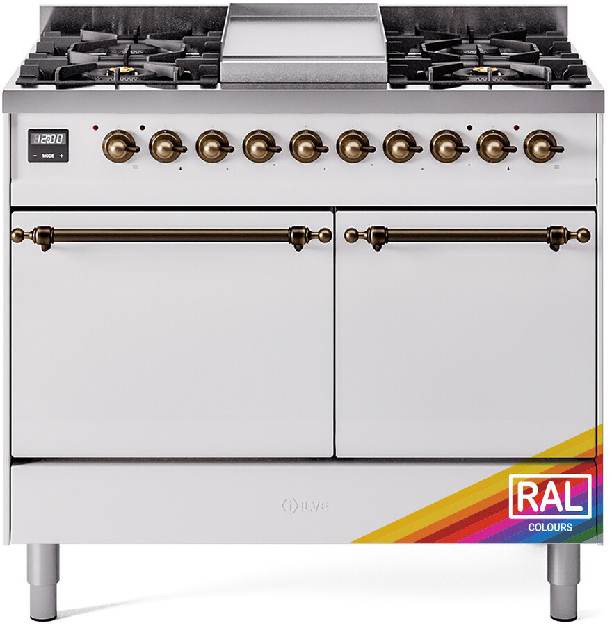Freestanding Dual Fuel Range with 6 Sealed Burners, 4.3 cu. ft. Total Capacity, Storage Drawer, and Griddle: RAL Color, Bronze Trim, Solid Door. Enjoy a range of cooking options with six sealed burners, offering precise heat control for any recipe. With 4.3 cubic feet of oven space, you can easily prepare meals of all sizes, from weeknight dinners to holiday feasts. Keep your kitchen essentials organized and close at hand with the convenient storage drawer. Expand your cooking repertoire with the built-in griddle, perfect for making breakfast favorites and grilled sandwiches. With power up to 25000 btu as standard. Optimal supply and perfect distribution of the heat, for all types of cooking. With non-stick nanotechnological treatment. The noble technical characteristics of brass are enriched with a nanotechnological coating that assures easy cleaning, with an elegant Total Black finish. Structure in AISI 304 steel with 12/10 thickness, option to choose the ideal combination between a gas hob with up to 9 burners or induction, mixed and in various setups. The indestructible cast iron pan supports provide a functional and safe support for the pots. The electronic control ensures that the temperature of the oven remains constant throughout, without fluctuating, as is the case in conventional ovens. It can be set with precision starting from 85F, for perfect proofing, up to 575F, for roasting. The door hinges are fitted with a shock absorber that makes the closure more gradual and noiseless. The quick oven preheating function allows it to reach the desired temperature in a short time and you can then choose the best-suited cooking mode for the dish. It also works as rapid defrosting when a low temperature is set (85F 105F). The grease does not stick to the surface and can therefore be cleaned more easily. Pizza function. Quick start. Multiple fan cooking. Intensive cooking. Fan grill cooking. Grill cooking with closed-door. Cooking from above. Cooking from below. Static normal cooking. Grill cooking with closed-door. Cooking from above. Cooking from below. Static normal cooking. Series: Nostalgie II. Noblesse Frames: No. Fuel Type: Dual Fuel. Installation Type: Freestanding. Oven Total Capacity (cu. ft.): 4.3. Sabbath Mode: No. Number of Racks: 2. Drawer Type: Storage Drawer. Display Type: LCD Display. Timer: Yes. Cooking Probe: Yes. Rotisserie: Yes. Soft Close Door: Yes. Cooktop Configuration: 6 Sealed Burners + Griddle. Burner/Element Type: Sealed Burner. Number of Burners/Elements: 6. Griddle: Yes. Grill: No. French Top: No. Burner/Element Output 1: 25000 BTU/h 900 BTU/h. Burner/Element Output 2: 7000 BTU/h 1400 BTU/h. Burner/Element Output 3: 25000 BTU/h 900 BTU/h. Burner/Element Output 4: 10500 BTU/h 2000 BTU/h. Burner/Element Output 5: 10500 BTU/h 2000 BTU/h. Burner/Element Output 6: 10500 BTU/h 2000 BTU/h. Oven Control Type: Knobs. Oven Door Type: Solid Door. Number of Ovens: Double Oven. Main Oven Capacity (cu. ft.): 2.3. Second Oven Capacity (cu. ft.): 2. Oven Cleaning Type: Easy Clean Enamel Cavities. Main Oven Type: UOV 60 M. Second Oven Type: UOV 40 E. ADA Compliant: No. Star-K Certified: No. Voltage: 240 V. Amps: 26 A. Exterior Width: 40". Width: 39 3/8". Depth: 27". Height: 36 1/4" - 38 1/2".