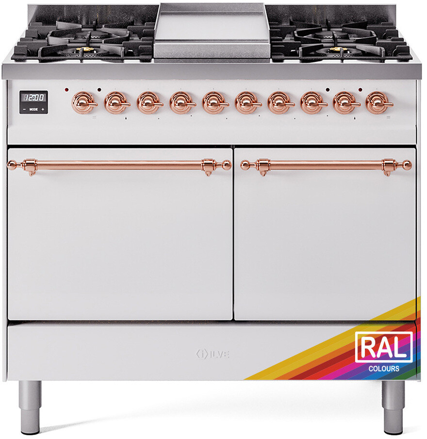 Freestanding Dual Fuel Range with 6 Sealed Burners, 4.3 cu. ft. Total Capacity, Storage Drawer, and Griddle: RAL Color, Copper Trim, Solid Door. Enjoy a range of cooking options with six sealed burners, offering precise heat control for any recipe. With 4.3 cubic feet of oven space, you can easily prepare meals of all sizes, from weeknight dinners to holiday feasts. Keep your kitchen essentials organized and close at hand with the convenient storage drawer. Expand your cooking repertoire with the built-in griddle, perfect for making breakfast favorites and grilled sandwiches. With power up to 25000 btu as standard. Optimal supply and perfect distribution of the heat, for all types of cooking. With non-stick nanotechnological treatment. The noble technical characteristics of brass are enriched with a nanotechnological coating that assures easy cleaning, with an elegant Total Black finish. Structure in AISI 304 steel with 12/10 thickness, option to choose the ideal combination between a gas hob with up to 9 burners or induction, mixed and in various setups. The indestructible cast iron pan supports provide a functional and safe support for the pots. The electronic control ensures that the temperature of the oven remains constant throughout, without fluctuating, as is the case in conventional ovens. It can be set with precision starting from 85F, for perfect proofing, up to 575F, for roasting. The door hinges are fitted with a shock absorber that makes the closure more gradual and noiseless. The quick oven preheating function allows it to reach the desired temperature in a short time and you can then choose the best-suited cooking mode for the dish. It also works as rapid defrosting when a low temperature is set (85F 105F). The grease does not stick to the surface and can therefore be cleaned more easily. Pizza function. Quick start. Multiple fan cooking. Intensive cooking. Fan grill cooking. Grill cooking with closed-door. Cooking from above. Cooking from below. Static normal cooking. Grill cooking with closed-door. Cooking from above. Cooking from below. Static normal cooking. Series: Nostalgie II. Noblesse Frames: No. Fuel Type: Dual Fuel. Installation Type: Freestanding. Oven Total Capacity (cu. ft.): 4.3. Sabbath Mode: No. Number of Racks: 2. Drawer Type: Storage Drawer. Display Type: LCD Display. Timer: Yes. Cooking Probe: Yes. Rotisserie: Yes. Soft Close Door: Yes. Cooktop Configuration: 6 Sealed Burners + Griddle. Burner/Element Type: Sealed Burner. Number of Burners/Elements: 6. Griddle: Yes. Grill: No. French Top: No. Burner/Element Output 1: 25000 BTU/h 900 BTU/h. Burner/Element Output 2: 7000 BTU/h 1400 BTU/h. Burner/Element Output 3: 25000 BTU/h 900 BTU/h. Burner/Element Output 4: 10500 BTU/h 2000 BTU/h. Burner/Element Output 5: 10500 BTU/h 2000 BTU/h. Burner/Element Output 6: 10500 BTU/h 2000 BTU/h. Oven Control Type: Knobs. Oven Door Type: Solid Door. Number of Ovens: Double Oven. Main Oven Capacity (cu. ft.): 2.3. Second Oven Capacity (cu. ft.): 2. Oven Cleaning Type: Easy Clean Enamel Cavities. Main Oven Type: UOV 60 M. Second Oven Type: UOV 40 E. ADA Compliant: No. Star-K Certified: No. Voltage: 240 V. Amps: 26 A. Exterior Width: 40". Width: 39 3/8". Depth: 27". Height: 36 1/4" - 38 1/2".