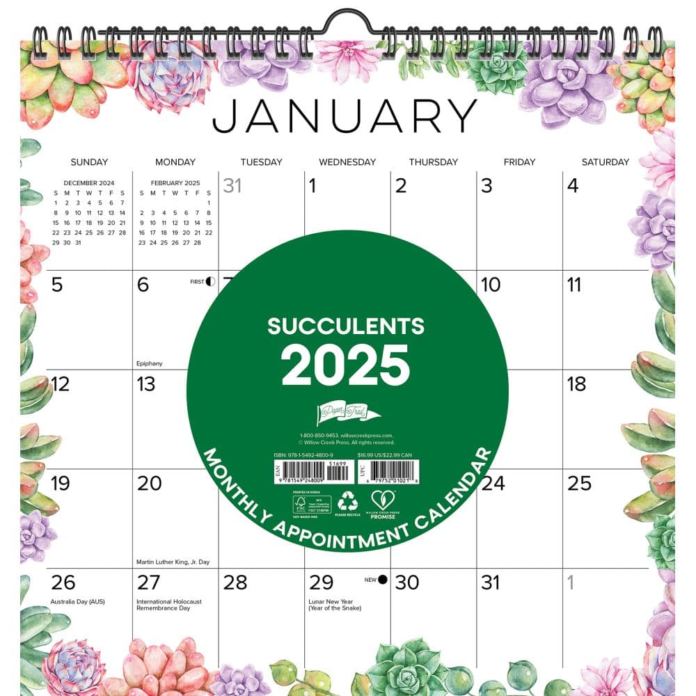 Succulents Spiral Art 2025 Wall Calendar by Willow Creek Press. This 12" x 12" wall calendar not only serves as a practical tool for planning and organization but also doubles as a stunning piece of art. Each month features beautifully illustrated succulents in a spiral design, adding a touch of nature's serenity to your daily routine. The sturdy metal loop ensures easy and secure hanging, making it a perfect addition to any home or office. Dimensions: 12" x 12", ideal for wall mounting in small or large spaces Features unruled daily blocks for flexible scheduling and notes Includes previous and next month references for convenient planning Lists major U.S. and international holidays, including moon phases (CST) Crafted with a durable spiral binding for easy page turning Start each month afresh with the Succulents Spiral Art 2025 Wall Calendar, which combines functionality with aesthetic appeal. The spacious grid layout allows for jotting down appointments, reminders, and personal notes, ensuring you stay organized all year round. Whether for personal use or as a thoughtful gift, this calendar is sure to delight anyone who receives it. Embrace a year of exquisite art and efficient planning. Order your Succulents Spiral Art 2025 Wall Calendar today and transform your planning into an art form!.