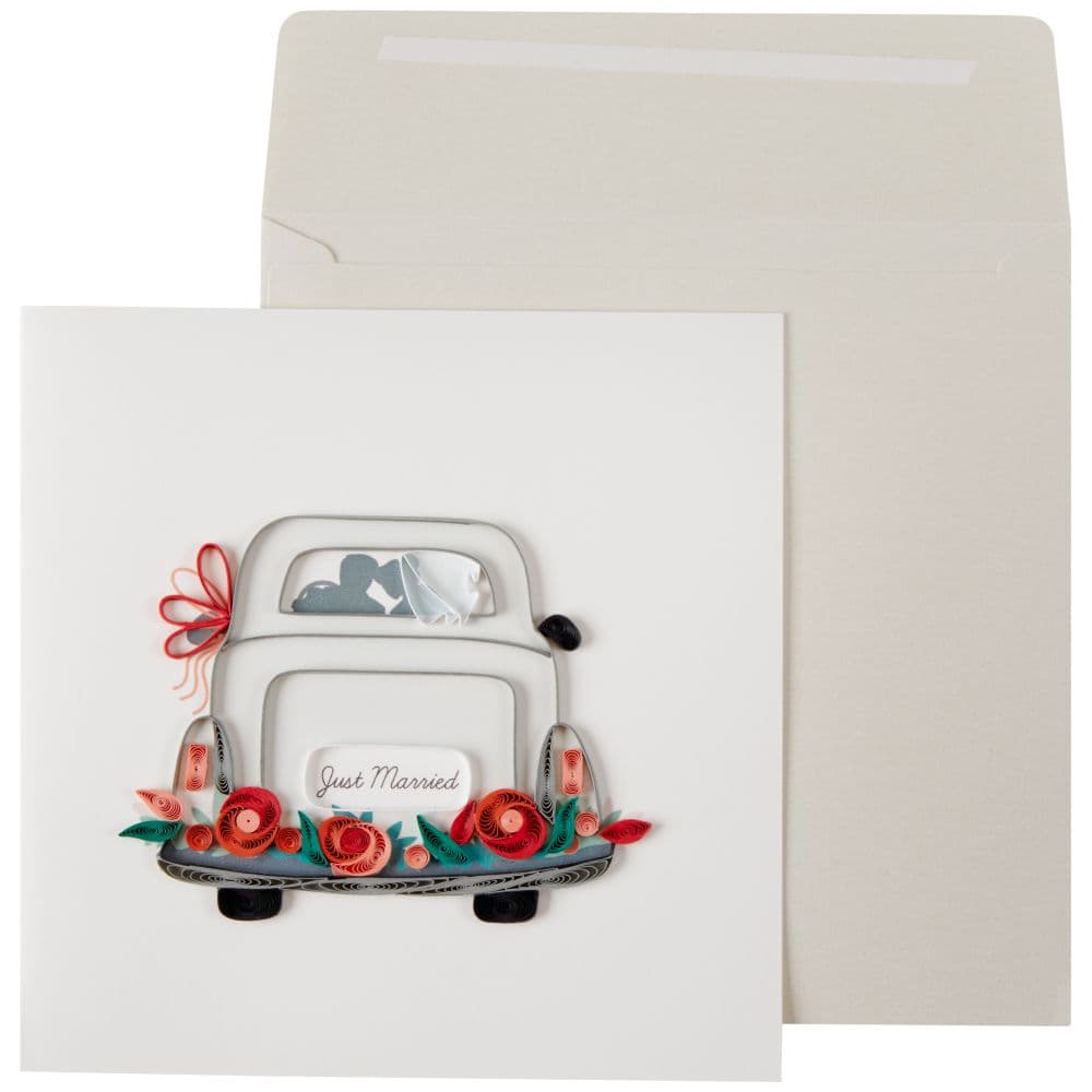 The perfect way to wish a special couple congratulations on their big day! NIQUEA.D's Just Married Car Wedding Card is the ideal memento of a beautiful union. Show your support for the happy couple with this unique greeting card, complete with an adorable paper filigree car for added charm. Inside the card you?ll discover the heartfelt sentiment of "Wishing you a wonderful and amazing journey together!" With its timeless aspect, this card is sure to be cherished for years to come. Send love and well wishes to your friends or family today Give them something special to commemorate their joyous occasion! Occasion: WeddingMeasures: 6 X 6Embellishment: Handmade Paper FiligreeSentiment: Wishing you a wonderful and amazing journey together!.