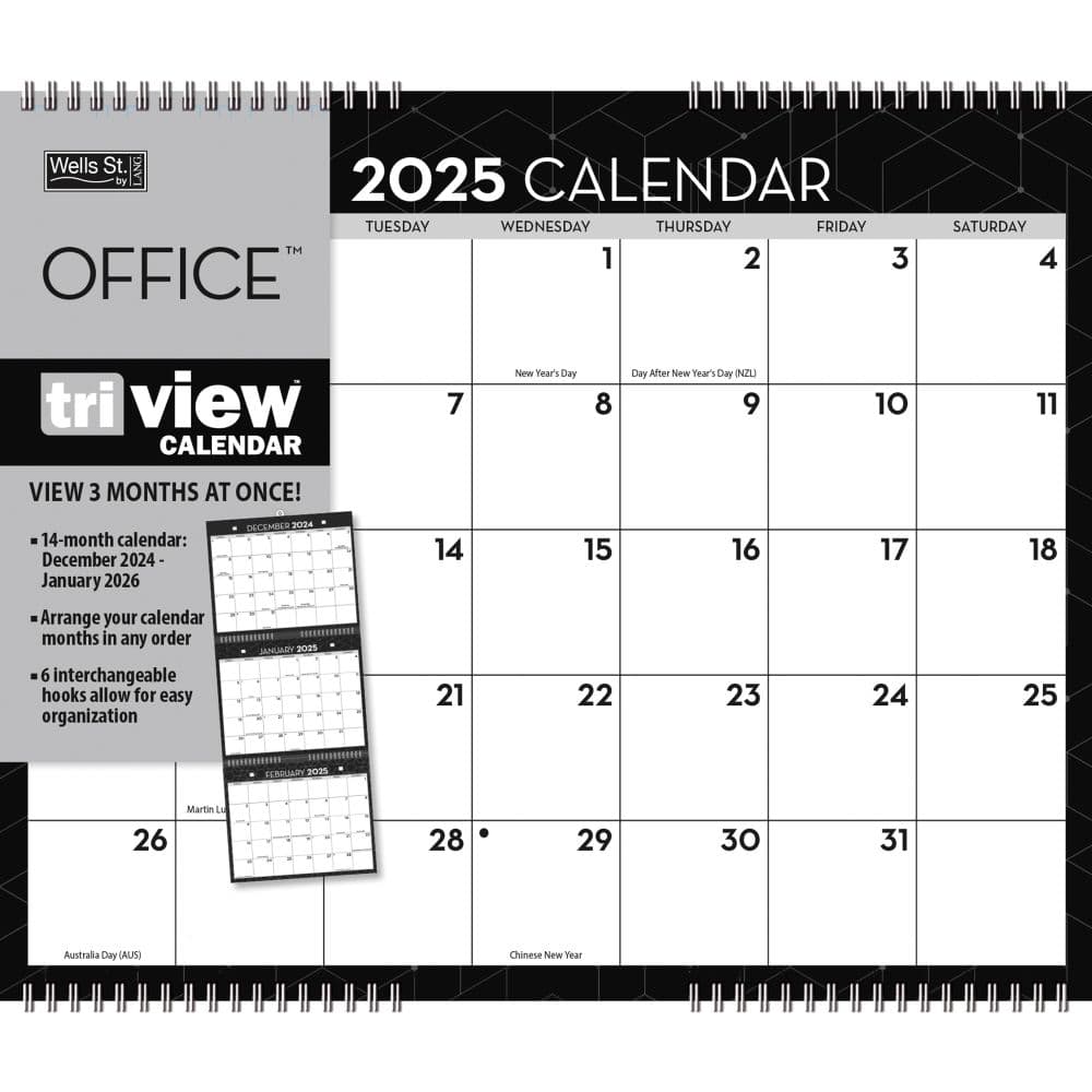 The 2025 TriView Office Wall Calendar by Wells Street by LANG is a meticulously designed organizational tool that offers a unique three-month view to keep your schedule on track. Perfect for professionals, families, or anyone needing to plan ahead, this calendar allows you to view and organize three months at a time, enhancing your ability to manage long-term projects and daily tasks alike. Features a 14-month span from December 2024 to January 2026, providing extended planning capabilities. Includes six interchangeable hooks for customizable monthly arrangement, ensuring optimal organization. Each month displays full moon, new moon, and quarter moon phases, aiding in scheduling around important lunar dates. Lists major U.S. and international holidays, including specific holidays for Australia, Canada, and the United Kingdom, keeping you aware of significant dates worldwide. Wire-O binding allows the calendar to hang flat against the wall, ensuring easy reading and sleek display. Crafted with a vertical layout and a clean, professional design, the TriView Calendar's large grid size offers ample space for noting appointments and reminders. This calendar not only serves as a practical tool for time management but also as a stylish addition to any office space. The high-quality paper and durable binding guarantee that it will remain a reliable resource throughout the year. Stay ahead of your schedule and never miss an important date with the 2025 TriView Office Wall Calendar. Ideal for meticulous planners and busy households. Order now to start planning your future with confidence and clarity!.