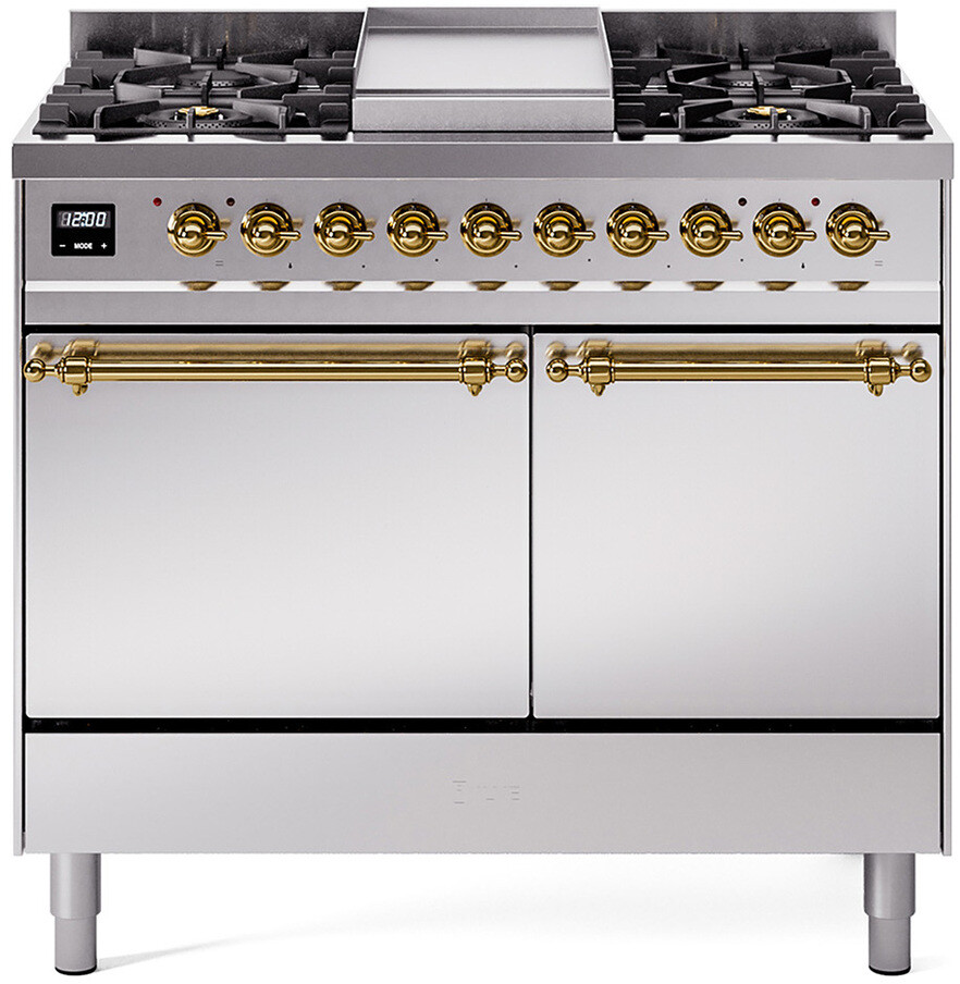 Solid Door Freestanding Dual Range with 6 Sealed Burner, 4.3 cu. ft. Total Capacity, Double Oven, Electronic Control, Storage Drawer, and Cast Iron Grates: Brass Trim. Enjoy a range of cooking options with six sealed burners, offering precise heat control for any recipe. With 4.3 cubic feet of oven space, you can easily prepare meals of all sizes, from weeknight dinners to holiday feasts. Keep your kitchen essentials organized and close at hand with the convenient storage drawer. Expand your cooking repertoire with the built-in griddle, perfect for making breakfast favorites and grilled sandwiches. With power up to 25000 btu as standard. Optimal supply and perfect distribution of the heat, for all types of cooking. With non-stick nanotechnological treatment. The noble technical characteristics of brass are enriched with a nanotechnological coating that assures easy cleaning, with an elegant Total Black finish. Structure in AISI 304 steel with 12/10 thickness, option to choose the ideal combination between a gas hob with up to 9 burners or induction, mixed and in various setups. The indestructible cast iron pan supports provide a functional and safe support for the pots. The electronic control ensures that the temperature of the oven remains constant throughout, without fluctuating, as is the case in conventional ovens. It can be set with precision starting from 85F, for perfect proofing, up to 575F, for roasting. The door hinges are fitted with a shock absorber that makes the closure more gradual and noiseless. The quick oven preheating function allows it to reach the desired temperature in a short time and you can then choose the best-suited cooking mode for the dish. It also works as rapid defrosting when a low temperature is set (85F 105F). The grease does not stick to the surface and can therefore be cleaned more easily. Pizza function. Quick start. Multiple fan cooking. Intensive cooking. Fan grill cooking. Grill cooking with closed-door. Cooking from above. Cooking from below. Static normal cooking. Grill cooking with closed-door. Cooking from above. Cooking from below. Static normal cooking. Series: Nostalgie II. Noblesse Frames: No. Fuel Type: Dual Fuel. Installation Type: Freestanding. Oven Total Capacity (cu. ft.): 4.3. Sabbath Mode: No. Number of Racks: 2. Drawer Type: Storage Drawer. Display Type: LCD Display. Timer: Yes. Cooking Probe: Yes. Rotisserie: Yes. Soft Close Door: Yes. Cooktop Configuration: 6 Sealed Burners + Griddle. Burner/Element Type: Sealed Burner. Number of Burners/Elements: 6. Griddle: Yes. Grill: No. French Top: No. Burner/Element Output 1: 25000 BTU/h 900 BTU/h. Burner/Element Output 2: 7000 BTU/h 1400 BTU/h. Burner/Element Output 3: 25000 BTU/h 900 BTU/h. Burner/Element Output 4: 10500 BTU/h 2000 BTU/h. Burner/Element Output 5: 10500 BTU/h 2000 BTU/h. Burner/Element Output 6: 10500 BTU/h 2000 BTU/h. Oven Control Type: Knobs. Oven Door Type: Solid Door. Number of Ovens: Double Oven. Main Oven Capacity (cu. ft.): 2.3. Second Oven Capacity (cu. ft.): 2. Oven Cleaning Type: Easy Clean Enamel Cavities. Main Oven Type: UOV 60 M. Second Oven Type: UOV 40 E. ADA Compliant: No. Star-K Certified: No. Voltage: 240 V. Amps: 26 A. Exterior Width: 40". Width: 39 3/8". Depth: 27". Height: 36 1/4" - 38 1/2".