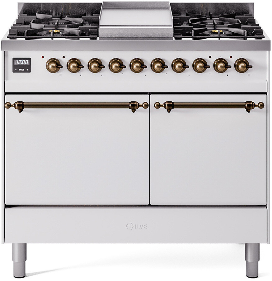 Freestanding Dual Fuel Range with 6 Sealed Burners, 4.3 cu. ft. Total Capacity, Storage Drawer, and Griddle: White, Bronze Trim, Solid Door. Enjoy a range of cooking options with six sealed burners, offering precise heat control for any recipe. With 4.3 cubic feet of oven space, you can easily prepare meals of all sizes, from weeknight dinners to holiday feasts. Keep your kitchen essentials organized and close at hand with the convenient storage drawer. Expand your cooking repertoire with the built-in griddle, perfect for making breakfast favorites and grilled sandwiches. With power up to 25000 btu as standard. Optimal supply and perfect distribution of the heat, for all types of cooking. With non-stick nanotechnological treatment. The noble technical characteristics of brass are enriched with a nanotechnological coating that assures easy cleaning, with an elegant Total Black finish. Structure in AISI 304 steel with 12/10 thickness, option to choose the ideal combination between a gas hob with up to 9 burners or induction, mixed and in various setups. The indestructible cast iron pan supports provide a functional and safe support for the pots. The electronic control ensures that the temperature of the oven remains constant throughout, without fluctuating, as is the case in conventional ovens. It can be set with precision starting from 85F, for perfect proofing, up to 575F, for roasting. The door hinges are fitted with a shock absorber that makes the closure more gradual and noiseless. The quick oven preheating function allows it to reach the desired temperature in a short time and you can then choose the best-suited cooking mode for the dish. It also works as rapid defrosting when a low temperature is set (85F 105F). The grease does not stick to the surface and can therefore be cleaned more easily. Pizza function. Quick start. Multiple fan cooking. Intensive cooking. Fan grill cooking. Grill cooking with closed-door. Cooking from above. Cooking from below. Static normal cooking. Grill cooking with closed-door. Cooking from above. Cooking from below. Static normal cooking. Series: Nostalgie II. Noblesse Frames: No. Fuel Type: Dual Fuel. Installation Type: Freestanding. Oven Total Capacity (cu. ft.): 4.3. Sabbath Mode: No. Number of Racks: 2. Drawer Type: Storage Drawer. Display Type: LCD Display. Timer: Yes. Cooking Probe: Yes. Rotisserie: Yes. Soft Close Door: Yes. Cooktop Configuration: 6 Sealed Burners + Griddle. Burner/Element Type: Sealed Burner. Number of Burners/Elements: 6. Griddle: Yes. Grill: No. French Top: No. Burner/Element Output 1: 25000 BTU/h 900 BTU/h. Burner/Element Output 2: 7000 BTU/h 1400 BTU/h. Burner/Element Output 3: 25000 BTU/h 900 BTU/h. Burner/Element Output 4: 10500 BTU/h 2000 BTU/h. Burner/Element Output 5: 10500 BTU/h 2000 BTU/h. Burner/Element Output 6: 10500 BTU/h 2000 BTU/h. Oven Control Type: Knobs. Oven Door Type: Solid Door. Number of Ovens: Double Oven. Main Oven Capacity (cu. ft.): 2.3. Second Oven Capacity (cu. ft.): 2. Oven Cleaning Type: Easy Clean Enamel Cavities. Main Oven Type: UOV 60 M. Second Oven Type: UOV 40 E. ADA Compliant: No. Star-K Certified: No. Voltage: 240 V. Amps: 26 A. Exterior Width: 40". Width: 39 3/8". Depth: 27". Height: 36 1/4" - 38 1/2".