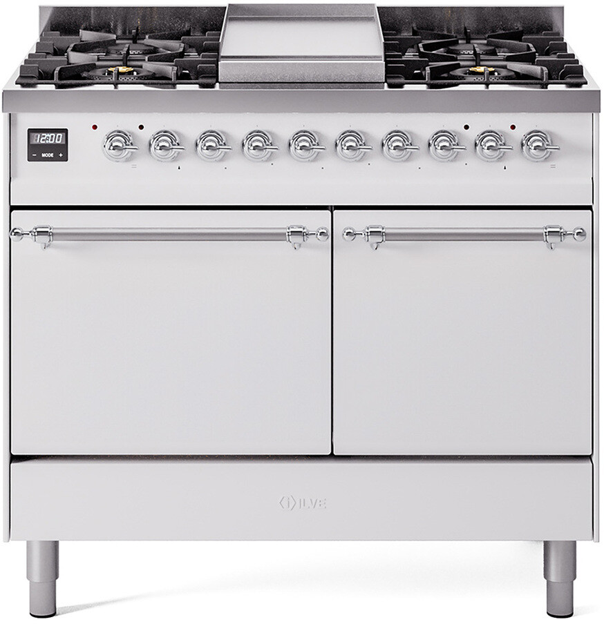 Freestanding Dual Fuel Range with 6 Sealed Burners, 4.3 cu. ft. Total Capacity, Storage Drawer, and Griddle: White, Chrome Trim, Solid Door. Enjoy a range of cooking options with six sealed burners, offering precise heat control for any recipe. With 4.3 cubic feet of oven space, you can easily prepare meals of all sizes, from weeknight dinners to holiday feasts. Keep your kitchen essentials organized and close at hand with the convenient storage drawer. Expand your cooking repertoire with the built-in griddle, perfect for making breakfast favorites and grilled sandwiches. With power up to 25000 btu as standard. Optimal supply and perfect distribution of the heat, for all types of cooking. With non-stick nanotechnological treatment. The noble technical characteristics of brass are enriched with a nanotechnological coating that assures easy cleaning, with an elegant Total Black finish. Structure in AISI 304 steel with 12/10 thickness, option to choose the ideal combination between a gas hob with up to 9 burners or induction, mixed and in various setups. The indestructible cast iron pan supports provide a functional and safe support for the pots. The electronic control ensures that the temperature of the oven remains constant throughout, without fluctuating, as is the case in conventional ovens. It can be set with precision starting from 85F, for perfect proofing, up to 575F, for roasting. The door hinges are fitted with a shock absorber that makes the closure more gradual and noiseless. The quick oven preheating function allows it to reach the desired temperature in a short time and you can then choose the best-suited cooking mode for the dish. It also works as rapid defrosting when a low temperature is set (85F 105F). The grease does not stick to the surface and can therefore be cleaned more easily. Pizza function. Quick start. Multiple fan cooking. Intensive cooking. Fan grill cooking. Grill cooking with closed-door. Cooking from above. Cooking from below. Static normal cooking. Grill cooking with closed-door. Cooking from above. Cooking from below. Static normal cooking. Series: Nostalgie II. Noblesse Frames: No. Fuel Type: Dual Fuel. Installation Type: Freestanding. Oven Total Capacity (cu. ft.): 4.3. Sabbath Mode: No. Number of Racks: 2. Drawer Type: Storage Drawer. Display Type: LCD Display. Timer: Yes. Cooking Probe: Yes. Rotisserie: Yes. Soft Close Door: Yes. Cooktop Configuration: 6 Sealed Burners + Griddle. Burner/Element Type: Sealed Burner. Number of Burners/Elements: 6. Griddle: Yes. Grill: No. French Top: No. Burner/Element Output 1: 25000 BTU/h 900 BTU/h. Burner/Element Output 2: 7000 BTU/h 1400 BTU/h. Burner/Element Output 3: 25000 BTU/h 900 BTU/h. Burner/Element Output 4: 10500 BTU/h 2000 BTU/h. Burner/Element Output 5: 10500 BTU/h 2000 BTU/h. Burner/Element Output 6: 10500 BTU/h 2000 BTU/h. Oven Control Type: Knobs. Oven Door Type: Solid Door. Number of Ovens: Double Oven. Main Oven Capacity (cu. ft.): 2.3. Second Oven Capacity (cu. ft.): 2. Oven Cleaning Type: Easy Clean Enamel Cavities. Main Oven Type: UOV 60 M. Second Oven Type: UOV 40 E. ADA Compliant: No. Star-K Certified: No. Voltage: 240 V. Amps: 26 A. Exterior Width: 40". Width: 39 3/8". Depth: 27". Height: 36 1/4" - 38 1/2".