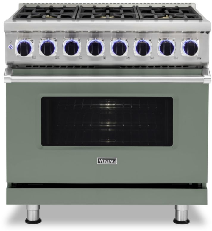 Freestanding Dual-Fuel Range with 6 Viking Elevation Sealed Burners, Vari-Speed Dual Flow Convection Oven, GourmetGlo Infrared Broiler, VariSimmer Setting, 12 Oven Cooking Modes, TruGlide Full Extension Racks and GentleClose Door: Eucalyptus, NG. Elevation Burners with brass flame ports boast 23,000 BTUs across the front of all width configurations, with multiple 15,000 BTUs and one 8,000 BTU burner across the rear. This convection system has the largest fan in the industry; the 8-1/2" two speed fan works bi-directionally for maximum airflow and excellent cooking results. This Viking exclusive infrared broiler provides intense heat to lock in savory juices. VariSimmer on ALL burners provides gentle, even simmering at precisely low cooking temperatures. The exclusive Preheat system provides one of the fastest preheat times - so your oven is ready to begin cooking when you are (right oven on 48"W. range). Enjoy 12 high-performance cooking modes: bake, convection bake, TruConvec Convection Cooking, convection roast, hi, med and low broil, convection broil, convection dehydrate, convection defrost, proof (left oven on 48"W. range), and self-clean. Largest self-clean oven in the industry has enough space to accommodate various size bakeware for multi-rack cooking. The BlackChrome knobs with CoolLit LED backlighting are pleasing to look at and nice to the touch as well. The ignition system ensures automatic ignition/re-ignition, should the burners extinguish at any time while cooking. TruGlide racks fully extend for safe and easy removal of heavy bakeware. The patented GentleCloose door slowly closes, ensuring delicate baked goods are not disturbed. Large Viewing Window. Porcelain Burner Pan. Removable Grates, Burner Caps & Knobs. Gas Requirements: Accepts Standard Residential 1/2" ID Gas Service Line. Gas Manifold Pressure - Natural Gas: 5.0" W.C.P. Gas Manifold Pressure - Liquid Propane: 10.0" W.C.P. Electrical Requirements: 240/208 VAC/60Hz. Max Amp Usage: 240V - 28.5 Amps / 208V - 24.7 Amps. Overall Width: 35-7/8". Overall Depth To End Of Side Panel: 25-1/4". Overall Depth To Front Of Door: 26-15/16". Overall Depth To End Of Door Handle: 30". Overall Height: 35-15/16" - 37-9/16". Additions To Base Height - Island Trim: Add 1". Additions To Base Height - Backguard: Add 10". Additions To Base Height - High Shelf: Add 24-1/8". Approx. Shipping Weight: 525.0 Lbs.