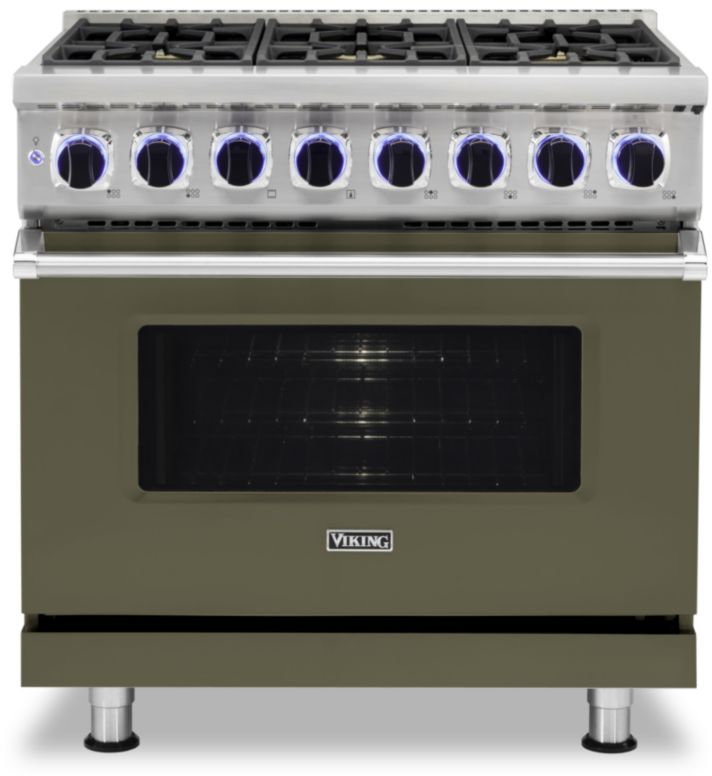 Freestanding Dual-Fuel Range with 6 Viking Elevation Sealed Burners, Vari-Speed Dual Flow Convection Oven, GourmetGlo Infrared Broiler, VariSimmer Setting, 12 Oven Cooking Modes, TruGlide Full Extension Racks and GentleClose Door: Martini, NG. Elevation Burners with brass flame ports boast 23,000 BTUs across the front of all width configurations, with multiple 15,000 BTUs and one 8,000 BTU burner across the rear. This convection system has the largest fan in the industry; the 8-1/2" two speed fan works bi-directionally for maximum airflow and excellent cooking results. This Viking exclusive infrared broiler provides intense heat to lock in savory juices. VariSimmer on ALL burners provides gentle, even simmering at precisely low cooking temperatures. The exclusive Preheat system provides one of the fastest preheat times - so your oven is ready to begin cooking when you are (right oven on 48"W. range). Enjoy 12 high-performance cooking modes: bake, convection bake, TruConvec Convection Cooking, convection roast, hi, med and low broil, convection broil, convection dehydrate, convection defrost, proof (left oven on 48"W. range), and self-clean. Largest self-clean oven in the industry has enough space to accommodate various size bakeware for multi-rack cooking. The BlackChrome knobs with CoolLit LED backlighting are pleasing to look at and nice to the touch as well. The ignition system ensures automatic ignition/re-ignition, should the burners extinguish at any time while cooking. TruGlide racks fully extend for safe and easy removal of heavy bakeware. The patented GentleCloose door slowly closes, ensuring delicate baked goods are not disturbed. Large Viewing Window. Porcelain Burner Pan. Removable Grates, Burner Caps & Knobs. Gas Requirements: Accepts Standard Residential 1/2" ID Gas Service Line. Gas Manifold Pressure - Natural Gas: 5.0" W.C.P. Gas Manifold Pressure - Liquid Propane: 10.0" W.C.P. Electrical Requirements: 240/208 VAC/60Hz. Max Amp Usage: 240V - 28.5 Amps / 208V - 24.7 Amps. Overall Width: 35-7/8". Overall Depth To End Of Side Panel: 25-1/4". Overall Depth To Front Of Door: 26-15/16". Overall Depth To End Of Door Handle: 30". Overall Height: 35-15/16" - 37-9/16". Additions To Base Height - Island Trim: Add 1". Additions To Base Height - Backguard: Add 10". Additions To Base Height - High Shelf: Add 24-1/8". Approx. Shipping Weight: 525.0 Lbs.
