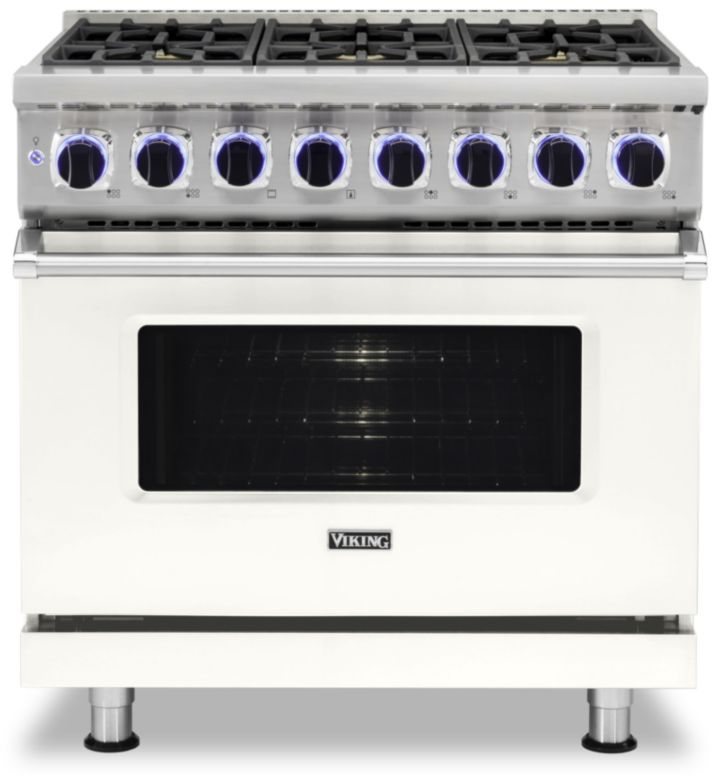 Freestanding Dual-Fuel Range with 6 Viking Elevation Sealed Burners, Vari-Speed Dual Flow Convection Oven, GourmetGlo Infrared Broiler, VariSimmer Setting, 12 Oven Cooking Modes, TruGlide Full Extension Racks and GentleClose Door: Pure White, NG. Elevation Burners with brass flame ports boast 23,000 BTUs across the front of all width configurations, with multiple 15,000 BTUs and one 8,000 BTU burner across the rear. This convection system has the largest fan in the industry; the 8-1/2" two speed fan works bi-directionally for maximum airflow and excellent cooking results. This Viking exclusive infrared broiler provides intense heat to lock in savory juices. VariSimmer on ALL burners provides gentle, even simmering at precisely low cooking temperatures. The exclusive Preheat system provides one of the fastest preheat times - so your oven is ready to begin cooking when you are (right oven on 48"W. range). Enjoy 12 high-performance cooking modes: bake, convection bake, TruConvec Convection Cooking, convection roast, hi, med and low broil, convection broil, convection dehydrate, convection defrost, proof (left oven on 48"W. range), and self-clean. Largest self-clean oven in the industry has enough space to accommodate various size bakeware for multi-rack cooking. The BlackChrome knobs with CoolLit LED backlighting are pleasing to look at and nice to the touch as well. The ignition system ensures automatic ignition/re-ignition, should the burners extinguish at any time while cooking. TruGlide racks fully extend for safe and easy removal of heavy bakeware. The patented GentleCloose door slowly closes, ensuring delicate baked goods are not disturbed. Large Viewing Window. Porcelain Burner Pan. Removable Grates, Burner Caps & Knobs. Gas Requirements: Accepts Standard Residential 1/2" ID Gas Service Line. Gas Manifold Pressure - Natural Gas: 5.0" W.C.P. Gas Manifold Pressure - Liquid Propane: 10.0" W.C.P. Electrical Requirements: 240/208 VAC/60Hz. Max Amp Usage: 240V - 28.5 Amps / 208V - 24.7 Amps. Overall Width: 35-7/8". Overall Depth To End Of Side Panel: 25-1/4". Overall Depth To Front Of Door: 26-15/16". Overall Depth To End Of Door Handle: 30". Overall Height: 35-15/16" - 37-9/16". Additions To Base Height - Island Trim: Add 1". Additions To Base Height - Backguard: Add 10". Additions To Base Height - High Shelf: Add 24-1/8". Approx. Shipping Weight: 525.0 Lbs.