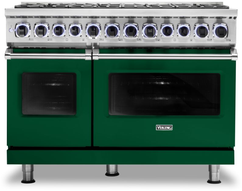 Freestanding Dual Fuel Range with 8 Sealed Burners, Double Oven, 7.3 Cu. Ft. Total Capacity, Continuous Grates, Self-Clean, CoolLit LED Lights, Rapid Ready Preheat, and Elevation Burners: Ivy, NG. EXCLUSIVE Viking Elevation Burners with brass flame ports boast 23,000 BTUs across the front of all width configurations, with multiple 15,000 BTUs and one 8,000 BTU burner across the rear. EXCLUSIVE VariSimmer Setting on ALL burners provides gentle, even simmering at precisely low cooking temperatures. EXCLUSIVE SureSpark Ignition System, ensures automatic ignition/re-ignition, should the burners extinguish at any time while cooking. Features the PATENT PENDING StayCool Trough Handle and grease containment system that strategically directs excess grease into a removable capture trough for quick and easy cleanup. Interchanges with the nonstick griddle providing versatility for griddling and easy cleanup. Heats evenly to provide consistent cooking across the entire surface and can be easily removed for cleaning. EXCLUSIVE GentleClose Door allows the door to slowly close, ensuring delicate baked goods are not disturbed. EXCLUSIVE TruGlide Full Extension Racks for safe and easy removal of heavy bakeware. NEW BlackChrome Knobs with CoolLit LED backlighting. Allows easy movement of pots and pans from burner to burner. PATENTED Vari-Speed Dual Flow Convection System has the largest fan in the industry; the 8 1/2" two-speed fan works bi-directionally for maximum airflow and excellent cooking results. EXCLUSIVE GourmetGlo Infrared Broiler provides intense heat to lock in savory juices. Concealed 10-pass dual bake element provides precise temperature control. EXCLUSIVE Rapid Ready Preheat provides one of the fastest preheats times - so your oven is ready to begin cooking when you are. The largest self-clean oven in the industry has enough space to accommodate various size bakeware for multi-rack cooking. Total Capacity: 7.3 Cu. Ft. Right Oven: 4.7 Cu. Ft. Left Oven: 2.6 Cu. Ft. Style: Freestanding. Cooktop: Sealed Burner. Drawer: None. Viewing Window: Yes. Fuel Type: Dual Fuel. Continuous Grates: Yes. Number of Burners: 8. Cooktop Control Type: Knobs. Oven Control Type: Knobs. Oven Racks: 5. Interior Oven Light: Yes. Self-Cleaning: Yes. Removable Door: Yes. Front Left Output: 23000. Back Left Output: 8000. Back Right Output: 15000. Front Right Output: 23000. Middle Front Left Output: 23000. Middle Back Left Output: 15000. Middle Front Right Output: 23000. Middle Back Right Output: 15000. BG107482SS: 10" H. Backguard for range. HS24748SS: 24" H. High shelf for range. P48CRTSS: Countertop rear trim for range. CRG7VGR: ViChrome Griddle accessory (for use with griddle model). CBGVGR: Bamboo Cover for 7 Series. LPKVGR: LP/Propane conversion kit for 7 Series. GCKVGR: Gas connector kit for 7 Series. WOKVGR7: Wok ring accessory for 7 Series. Electrical Requirements: See Electrical Requirements information in installation guide. Maximum Amp Usage: 240V - 43.0 amps / 208V - 37.3 amps. Overall Width: 47 7/8". Overall Height: To top of side trim - 35 15/16" min.; 37 9/16" max.; Legs adjust - 1 5/8". Overall Depth from Rear: To end of side panel - 25 1/4"; To the front of the door - 26 15/16"; To end of door handle - 30". Additions to Base Height: To top of island trim - add 1"; To the top of backguard - add 10"; To top of the high shelf - add 24 1/8". Oven Interior Width: Right oven - 25 5/16" / Left oven - 13 3/4". Oven Interior Height: 16 1/2". Oven Interior Depth: 19 1/2". Approximate Shipping Weight: 692 lbs. 2-Year Full: Complete product. 90-Day Full: Cosmetic parts such as glass, painted items, and decorative items. 5-Year Limited: All gas burners, electric elements (Dual Fuel).
