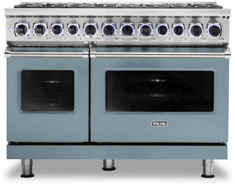 Freestanding Dual Fuel Range with 8 Sealed Burners, Double Oven, 7.3 Cu. Ft. Total Capacity, Continuous Grates, Self-Clean, CoolLit LED Lights, Rapid Ready Preheat, and Elevation Burners: November Sky, NG. EXCLUSIVE Viking Elevation Burners with brass flame ports boast 23,000 BTUs across the front of all width configurations, with multiple 15,000 BTUs and one 8,000 BTU burner across the rear. EXCLUSIVE VariSimmer Setting on ALL burners provides gentle, even simmering at precisely low cooking temperatures. EXCLUSIVE SureSpark Ignition System, ensures automatic ignition/re-ignition, should the burners extinguish at any time while cooking. Features the PATENT PENDING StayCool Trough Handle and grease containment system that strategically directs excess grease into a removable capture trough for quick and easy cleanup. Interchanges with the nonstick griddle providing versatility for griddling and easy cleanup. Heats evenly to provide consistent cooking across the entire surface and can be easily removed for cleaning. EXCLUSIVE GentleClose Door allows the door to slowly close, ensuring delicate baked goods are not disturbed. EXCLUSIVE TruGlide Full Extension Racks for safe and easy removal of heavy bakeware. NEW BlackChrome Knobs with CoolLit LED backlighting. Allows easy movement of pots and pans from burner to burner. PATENTED Vari-Speed Dual Flow Convection System has the largest fan in the industry; the 8 1/2" two-speed fan works bi-directionally for maximum airflow and excellent cooking results. EXCLUSIVE GourmetGlo Infrared Broiler provides intense heat to lock in savory juices. Concealed 10-pass dual bake element provides precise temperature control. EXCLUSIVE Rapid Ready Preheat provides one of the fastest preheats times - so your oven is ready to begin cooking when you are. The largest self-clean oven in the industry has enough space to accommodate various size bakeware for multi-rack cooking. Total Capacity: 7.3 Cu. Ft. Right Oven: 4.7 Cu. Ft. Left Oven: 2.6 Cu. Ft. Style: Freestanding. Cooktop: Sealed Burner. Drawer: None. Viewing Window: Yes. Fuel Type: Dual Fuel. Continuous Grates: Yes. Number of Burners: 8. Cooktop Control Type: Knobs. Oven Control Type: Knobs. Oven Racks: 5. Interior Oven Light: Yes. Self-Cleaning: Yes. Removable Door: Yes. Front Left Output: 23000. Back Left Output: 8000. Back Right Output: 15000. Front Right Output: 23000. Middle Front Left Output: 23000. Middle Back Left Output: 15000. Middle Front Right Output: 23000. Middle Back Right Output: 15000. BG107482SS: 10" H. Backguard for range. HS24748SS: 24" H. High shelf for range. P48CRTSS: Countertop rear trim for range. CRG7VGR: ViChrome Griddle accessory (for use with griddle model). CBGVGR: Bamboo Cover for 7 Series. LPKVGR: LP/Propane conversion kit for 7 Series. GCKVGR: Gas connector kit for 7 Series. WOKVGR7: Wok ring accessory for 7 Series. Electrical Requirements: See Electrical Requirements information in installation guide. Maximum Amp Usage: 240V - 43.0 amps / 208V - 37.3 amps. Overall Width: 47 7/8". Overall Height: To top of side trim - 35 15/16" min.; 37 9/16" max.; Legs adjust - 1 5/8". Overall Depth from Rear: To end of side panel - 25 1/4"; To the front of the door - 26 15/16"; To end of door handle - 30". Additions to Base Height: To top of island trim - add 1"; To the top of backguard - add 10"; To top of the high shelf - add 24 1/8". Oven Interior Width: Right oven - 25 5/16" / Left oven - 13 3/4". Oven Interior Height: 16 1/2". Oven Interior Depth: 19 1/2". Approximate Shipping Weight: 692 lbs. 2-Year Full: Complete product. 90-Day Full: Cosmetic parts such as glass, painted items, and decorative items. 5-Year Limited: All gas burners, electric elements (Dual Fuel).