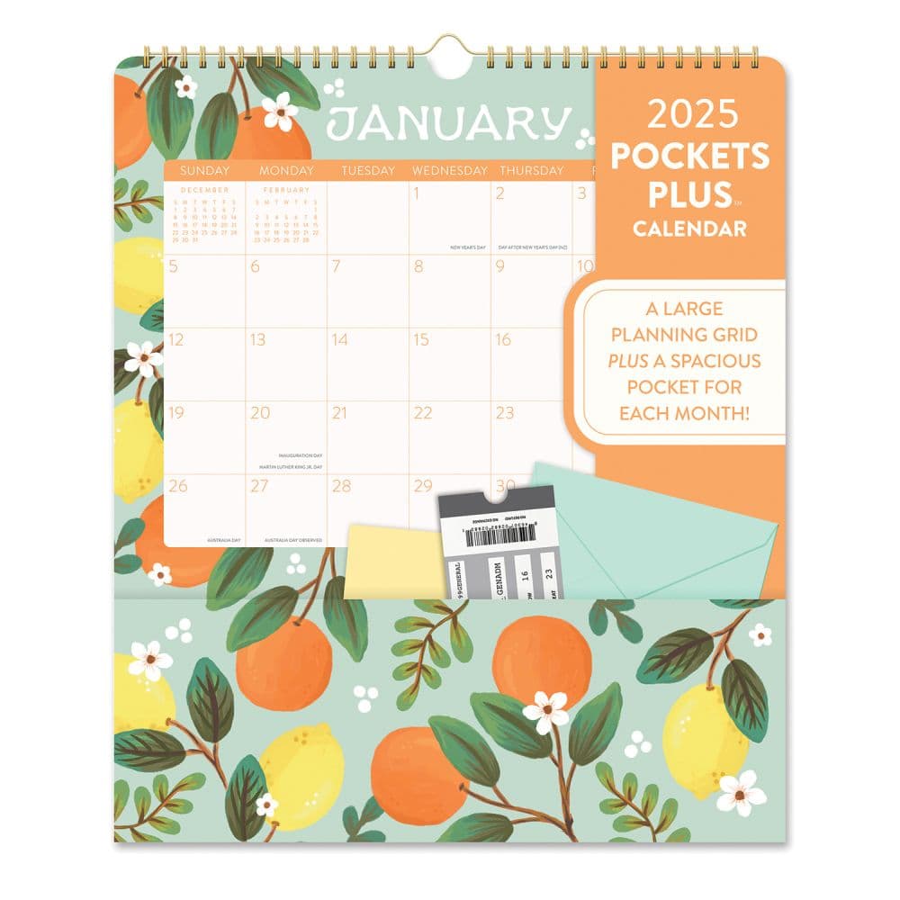 Keep your special mementos and daily schedules beautifully organized with the 2025 Fruit And Flora Pockets Plus Wall Calendar by Orange Circle Studio. Each month unveils a fresh, vibrant design of blooming flowers and ripening fruits, accompanied by a spacious pocket for storing cards, bills, and important documents. This calendar not only serves as a practical tool for planning but also enhances your space with its delightful artwork by Sherry Lee. Dimensions: Closed and Open size of 11.7 x 13.7 inches, perfect for wall hanging Features a large monthly grid with ample space for daily notes and reminders, starting each week on Sunday Includes a durable Wire-O binding for easy flipping and hanging Each month features a pocket for storing important items like tickets, notes, and small documents Printed on high-quality paper to ensure longevity and superb image reproduction Ideal for anyone who loves to stay organized and enjoys the beauty of hand-painted fruits and floral designs. This calendar is not just a planning tool, but a piece of art that brings a touch of nature's serenity to your daily routine. It's perfect for the kitchen, office, or any room that could use a splash of color and organization. Add a functional flourish to your wall with the 2025 Fruit And Flora Pockets Plus Wall Calendar. Order now to start planning your year in style!.