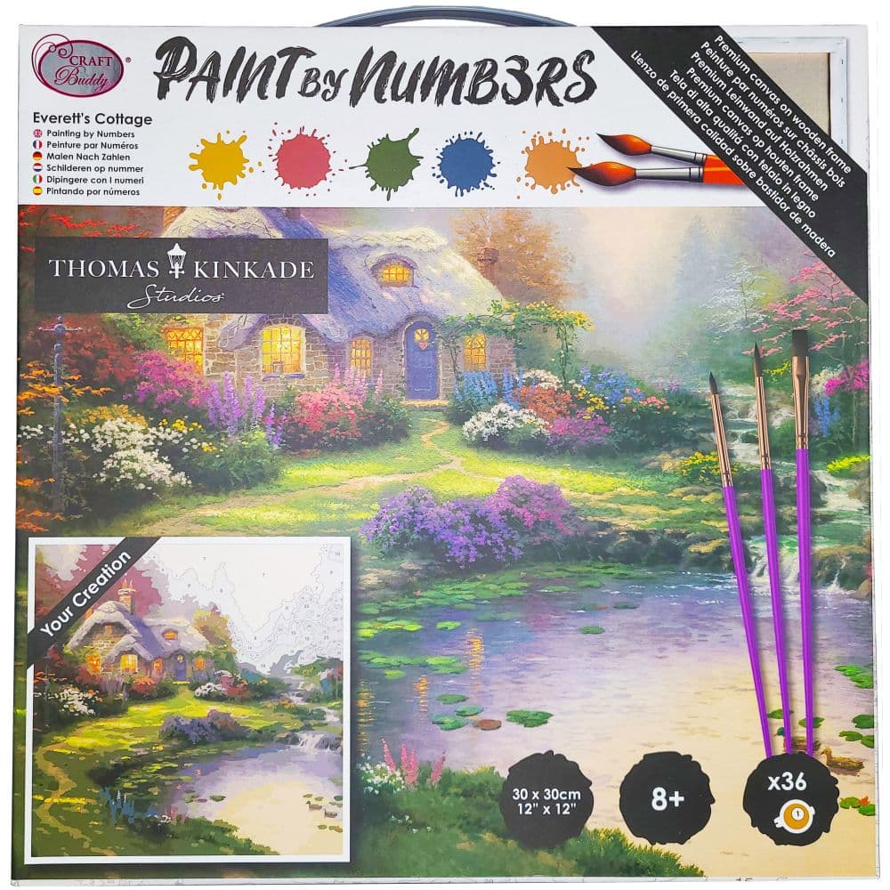 Thomas Kinkade is known to his millions of fans as the "Painter of Light". Popular for his pastoral and idyllic subjects, Thomas Kinkade's painting "Everett's Cottage" is brought to life with this premium quality Paint By Numbers kit. Includes pre-stretched canvas, a wide assortment of acrylic paints, 3 different sized brushes, and wall hanging fittings. Mounted canvas is 12" x 12".