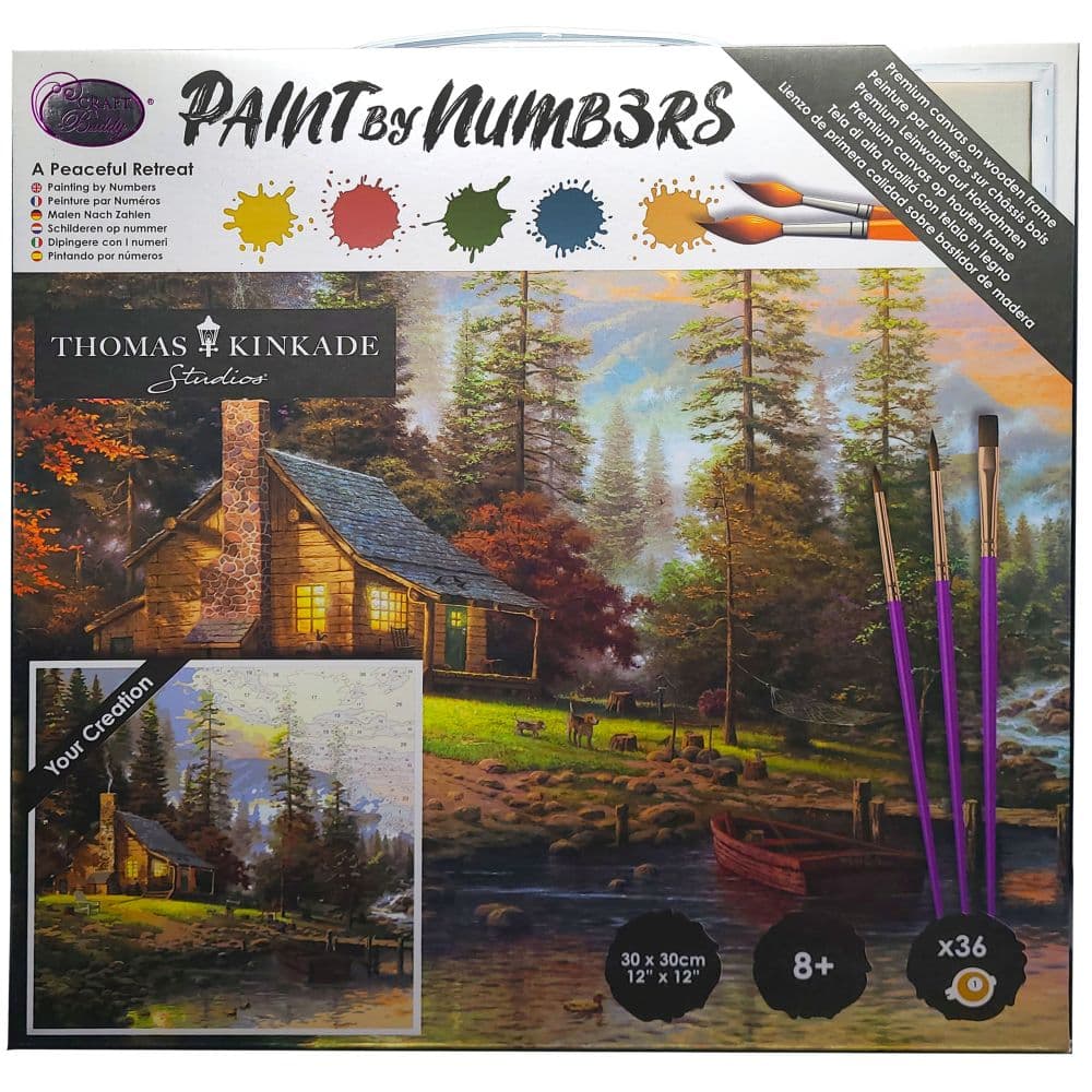 Thomas Kinkade is known to his millions of fans as the "Painter of Light". Popular for his pastoral and idyllic subjects, Thomas Kinkade's painting "A Peaceful Retreat" is brought to life with this premium quality Paint By Numbers kit. Includes pre-stretched canvas, a wide assortment of acrylic paints, 3 different sized brushes, and wall hanging fittings. Mounted canvas is 12" x 12".