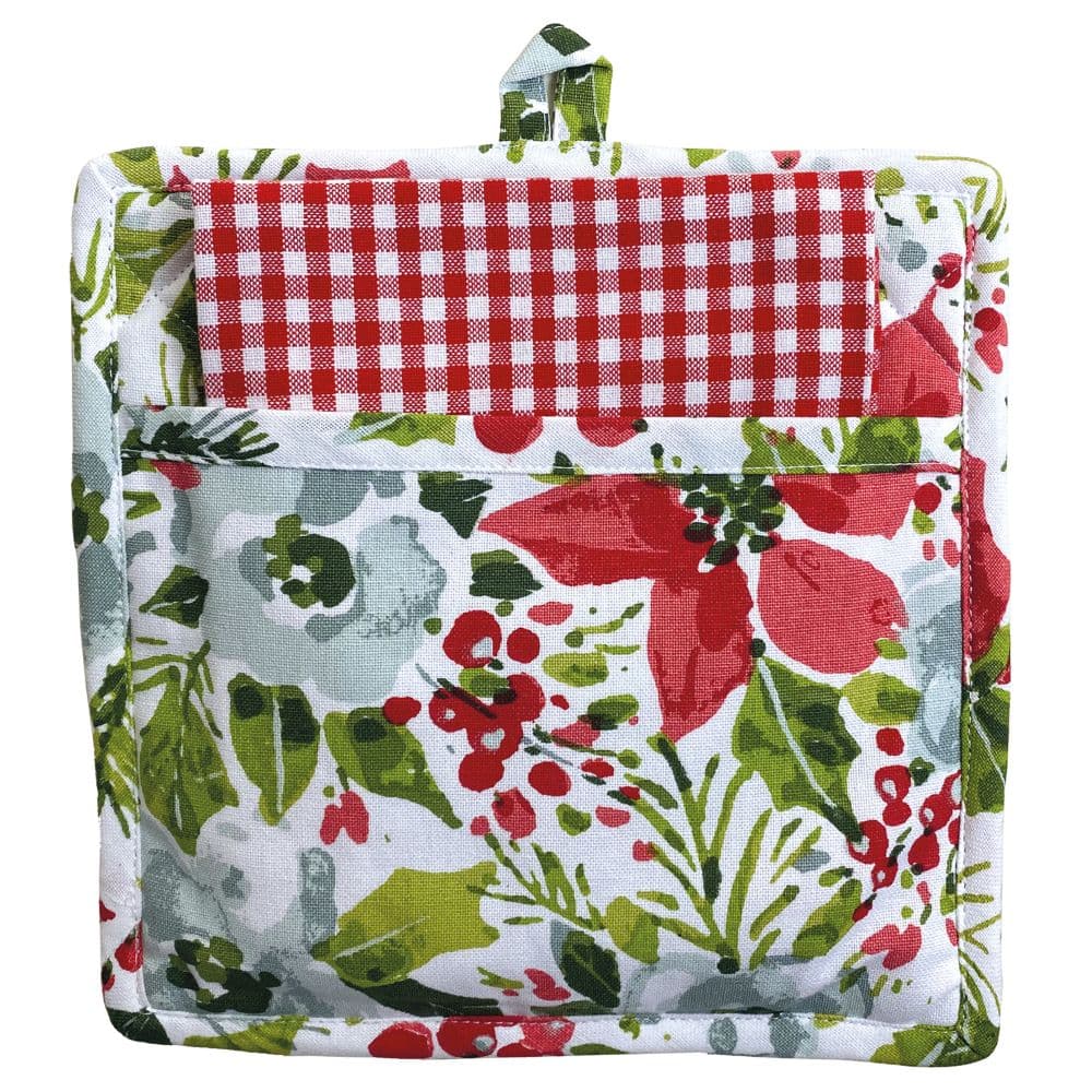 Turn your kitchen into a jolly poinsetta-filled cooking paradise with the Christmas Forever Potholder and Dishtowel Set. The colorful potholder has a quilted back for heat resistance and sewn in loop for hanging. Size is 9"W X 9"H. The matching woven dishtowel measures 18"W X 28" H. Both items are made with 100% cotton and have sewn-in loops for hanging. Artwork by Lisa Audit.