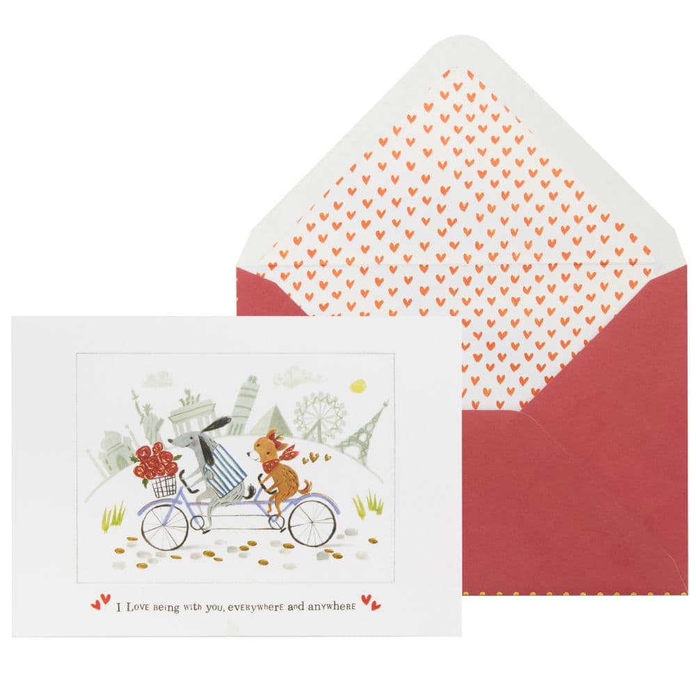 Do you have a special anniversary coming up? Make your best friend and forever love feel extra special with our Two Dogs Riding Bike Anniversary Card. The beautiful design shows two adorable dogs riding along on a tandem bicycle surrounded by a breathtaking city scenery and its illuminating Ferris wheel. This card has foil and embossing elements, making it even more unique and memorable. It reads ?I love being with you everywhere, and anywhere? ? what an amazing way to express to your beloved the joy of growing old together! Celebrate this meaningful event in the most delightful way possible and make a lasting impression for years to come. Order our Two Dogs Riding Bike Anniversary Card today ? your significant other will absolutely adore it! Occasion: AnniversaryMeasures: 5 X 7Embellishment: Foil, EmbossingSentiment: Happy Anniversary to my Best friend and forever LOVE.