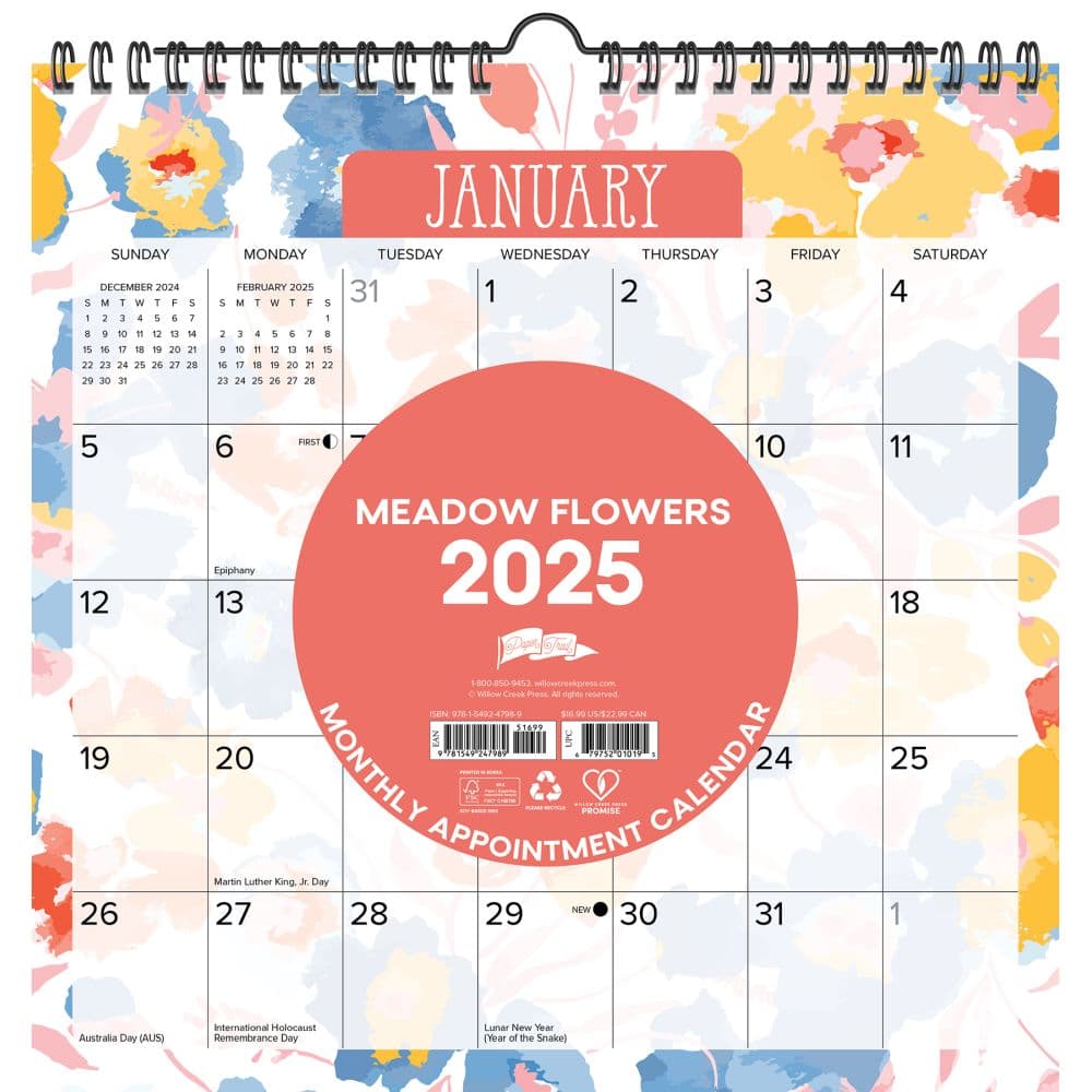 The Meadow Flowers Spiral Art 2025 Wall Calendar by Willow Creek Press is a vibrant and functional addition to any space. Designed to inspire and organize, this 12" x 12" calendar features a unique floral art design for each month, making it a perfect blend of beauty and practicality. The spiral binding allows for easy flipping, and the sturdy metal loop ensures it hangs securely on your wall. Size: 12" x 12", ideal for easy viewing and perfect for home or office walls. Features unruled daily blocks for unrestricted writing and planning flexibility. Includes previous and next month references on each page to assist with long-term planning. Lists major U.S. and international holidays, moon phases (CST), and special observances like Martin Luther King Jr. Day and International Holocaust Remembrance Day. Made with high-quality materials and spiral binding for durability and ease of use. This calendar not only helps you stay organized but also adds a touch of artistic flair to your daily planning. With its colorful and detailed floral patterns, it serves as a monthly reminder of nature's beauty while providing ample space for noting down appointments, reminders, and special events. Enhance your planning experience and beautify your space with the Meadow Flowers Spiral Art 2025 Wall Calendar. Perfect for anyone who appreciates art and organization. Order now to start your year with style and efficiency!.