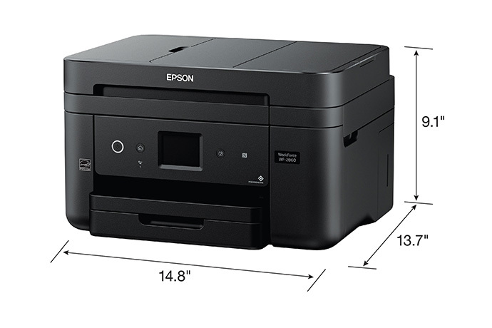 Amazing quality for all your critical projects - laser-quality black text for crisp, professional-quality proposals, reports and brochures Fast print speeds - 14 ISO ppm (black) and 7.5 ISO ppm (color) Better for your bottom line - uses up to 70 percent less power than laser printers4 Affordable individual ink cartridges - replace only the cartridge that runs outHands-free voice-activated printing** - ask Alexa to print a variety of creative projects and everyday documents, including your to-do and shopping lists. Designed for use exclusively with Epson cartridges*.Eco FeaturesUses up to 70% less power than laser printers4Save up to 50% of your paper supply with automatic, 2-sided printingRoHS compliantRecyclable product5Epson America, Inc. is a SmartWaySM Transport Partner6Better Products for a Better FutureFor more information on Epson's environmental programs, go to www. epson. com/environment. Epson WorkForce WF-2860 All-in-One Printer.