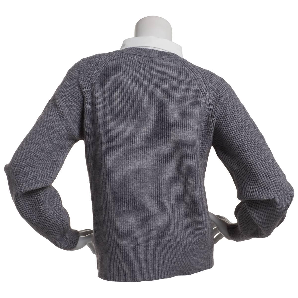 Pattern: Solid Sleeve Length: Long Sleeve Neck: V-Neck Collar: Spread Collar Peal accented 1/4 closure Contrasting neckline inlay Variegated rib-knit Linear hemline Low iron.