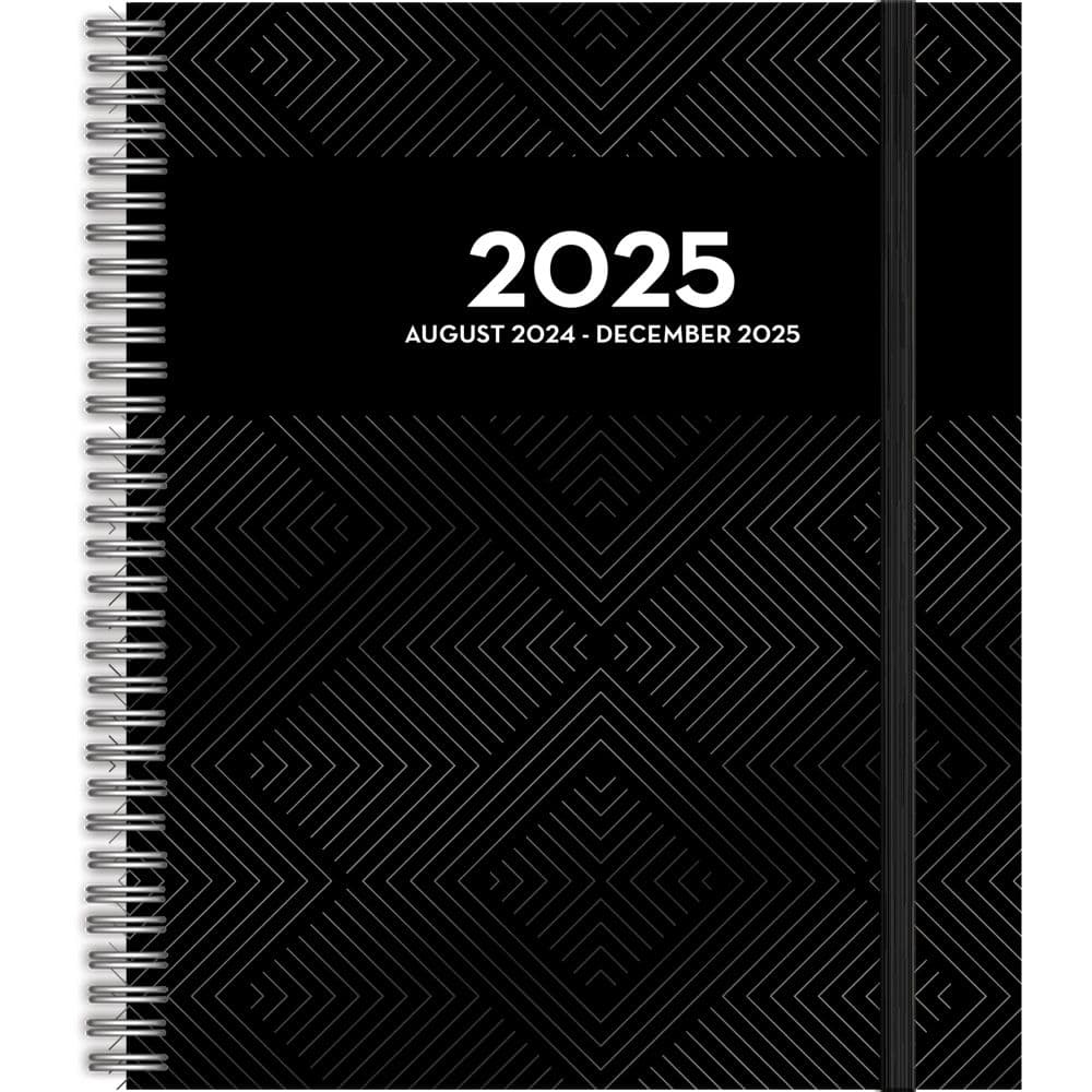 Stay organized and stylish with the 2025 Deluxe Office Planner by Lang Companies. This planner is designed to cater to professionals who appreciate a sleek, modern aesthetic combined with functionality. Spanning from August 2024 to December 2025, this planner is perfect for long-term planning and daily organization. Durable Wire-O binding allows the planner to lay flat on your desk or fold back for easy writing. Includes 624 reminder stickers to mark important dates and events, enhancing your planning efficiency. Features a secure elastic band closure to keep your planner closed and protected when not in use. Comes with a convenient storage pocket for keeping receipts, tickets, and other small items. Monthly and weekly calendar pages are decorated with a professional black and gray geometric pattern, offering a visually appealing and clear layout. Each monthly spread includes a notes section for important reminders, and the weekly spreads provide ample space for detailed scheduling. This planner also includes a personal information page to ensure your planner finds its way back to you if lost. Perfect for use in a corporate environment or for personal organization. Enhance your time management and stay ahead of your schedule with the 2025 Deluxe Office Planner. Ideal for professionals seeking a blend of style and practicality. Order now to take the first step towards a more organized year!.