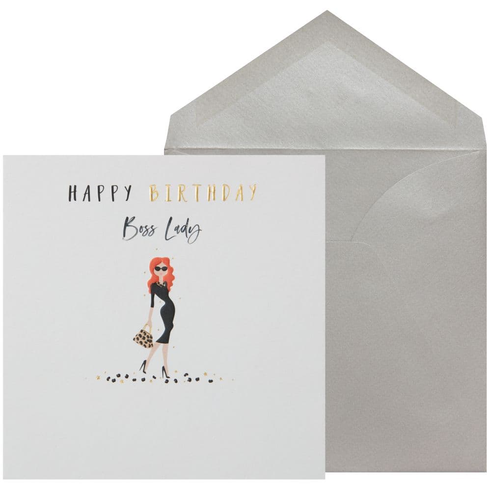 Let the ultimate 'Boss Lady' know she is adored on her special day with this beautiful NIQUEA.D Boss Lady Birthday Card. Designed with sophisticated style and grace, this card features a foil and embossed illustration of a woman standing confidently with her handbag, sure to remind your favorite boss lady just how fearless and fashion forward she is! With an added sentiment inside saying "To a woman With style & grace Have a fabulous Birthday," celebrate her big day in luxurious style with NIQUEA.D's Boss Lady Birthday Card. Occasion: BirthdayMeasures: 5 X 5Embellishment: Foil, EmbossingSentiment: To a woman With style & grace Have a fabulous Birthday.