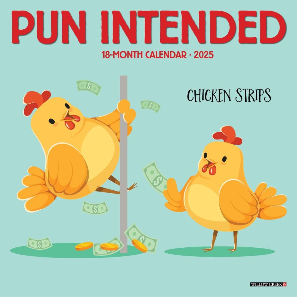 Brighten your days with the Pun Intended 2025 Mini Wall Calendar by Willow Creek Press. This charming 7" x 7" calendar is a delightful blend of humor and practicality, perfect for adding a touch of whimsy to any small space. Each month features a cleverly illustrated pun that promises to bring a smile to your face and a chuckle to your routine. Compact 7" x 7" size ideal for limited spaces like cubicles, kitchen walls, or inside lockers. Features a variety of pun-themed illustrations, such as 'Chicken Strips' and 'I'm a Little Chili', ensuring a year filled with laughter. Stapled binding for a neat and tidy look, easy to flip through the months. Includes moon phases, U.S., and international holidays to keep you up-to-date with important dates. Printed on high-quality, FSC-certified paper, supporting responsible forest management. With its clever puns and vibrant illustrations, this calendar not only serves as a functional planner but also as a source of daily entertainment. It's an excellent gift for anyone who enjoys humor or needs a light-hearted moment in their busy lives. Hang it at home, in the office, or gift it to a pun-loving friend to share the joy. Add a dash of humor to your year with the Pun Intended 2025 Mini Wall Calendar. Order now and start enjoying your days with a smile!.