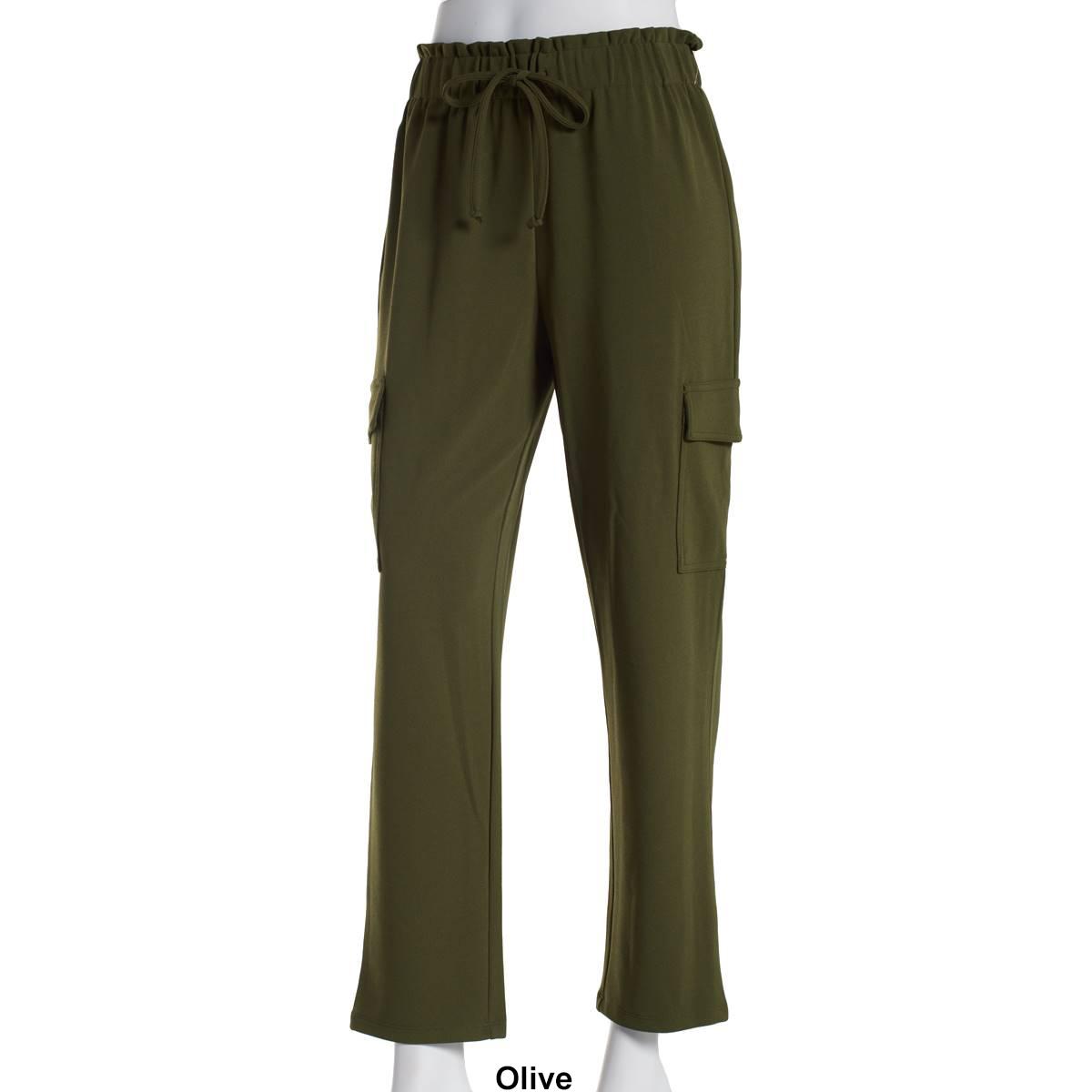 Pattern: Solid Leg Style: Tapered Paperbag style waist with tie closure Ruffle trim on waist Cargo pockets.