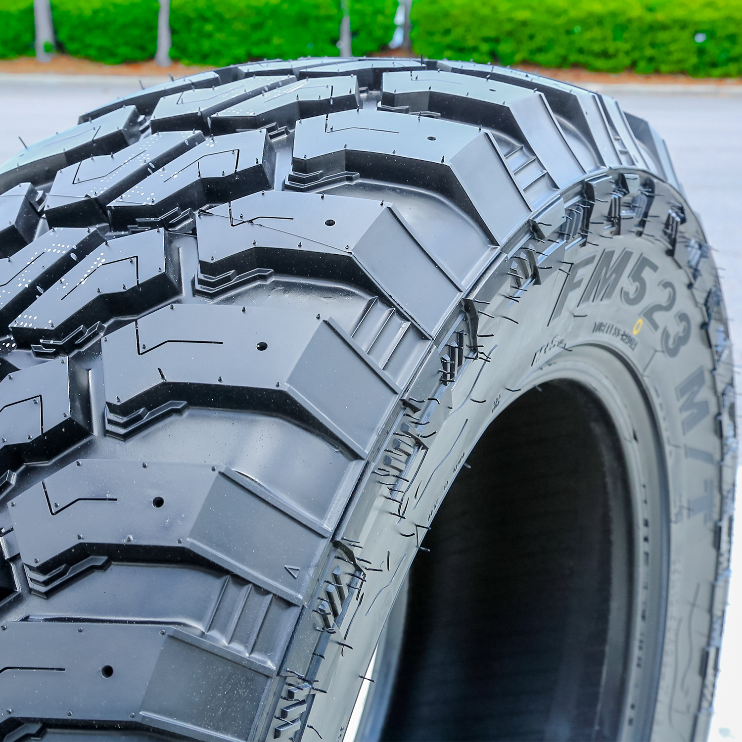 Kpatos FM523 M/T. FEATURES AND BENEFITS: Mud terrain traction; All weather traction; Increased controllability; . OVERVIEW: The Kpatos FM523 M/T is a mud terrain, all season tire manufactured for light trucks.The tire ensures excellent all weather traction. The large tread elements' symmetric pattern and the durable all season compound increase the dry, wet and winter weather traction. On off-road terrain surfaces, the tire is capable of performing throughout the year. The compound keeps its rubber flexibility from the heat of summer to the colder temperatures of winter, while the tread elements, with their slight siping detail, maintain a consistent grip year round. The wide grooves and open shoulders eliminate snow stuck in the grooves to further boost the all weather performance.The model's optimal tread design upgrades the off-road traction. The large, staggered tread blocks, high void ratio, open shoulder design and upper sidewall pattern work together to boost the soft and loose terrain gripping capability. They improve the tire's grip on all off-road surfaces to guarantee a safer performance. The upper sidewall tread design promotes the tire's forward motion in deep mud and loose dirt, preventing it from being stuck on such terrains. The tread elements keep the footprint clean of mud by dispersing it from between the elements. This pattern also prevents stone retention from harming the tire's casing by ejecting rocks from the footprint. The combined traction and constantly clean footprint provide a safer off-road driving experience.The FM523 M/T is easily controlled. The optimally placed tread block sequence on the tire's shoulders and center area improve the steering responsiveness and driving stability. The better contact increases the steering response time and accuracy to the driver's commands, while it stabilizes the structure against the driving pressure affecting the model. The shoulder blocks upgrade the maneuvering ability by increasing the number of biting edges firmly gripping the terrain surface. The better control and maneuvering capability enable the driver to confidently steer the vehicle in all weather and on all off-road terrain conditions.The intended purpose of Mud Terrain tire types is off-road use. They are not designed for regular highway driving. Manufacturers recommend changing tires every 10 years. As long as tires are properly stored before they are sold, the year of their manufacture will not shorten their service life.