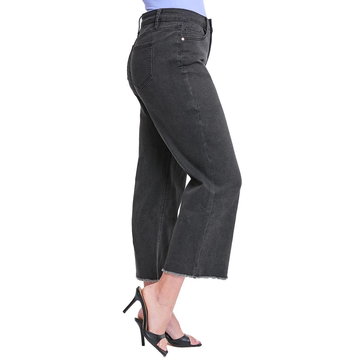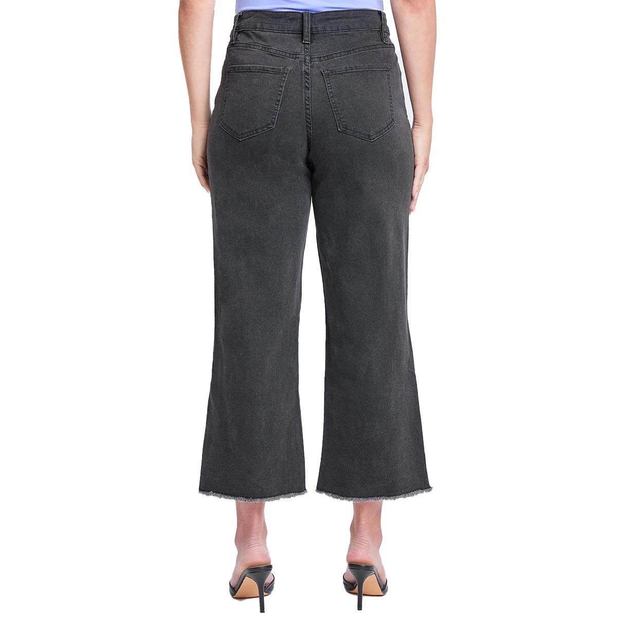 Pattern: Solid Leg Style: Wide Leg, Cropped Rise: High-Rise Fit: Slimming Shank button & zip fly closure Five-pocket construction Frayed hem details Rivet accenting Tummy control.