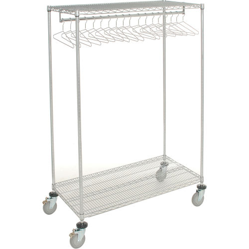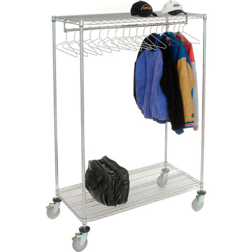 Nexel 2 Shelf Garment Floor Clothing Rack - Chrome This coat and clothing rack is an attractive solution to garment storage. Durable clothing rack is made from chrome plated steel which minimizes dust accumulation and resists denting, chipping and rusting. The full length coat rod holds up to 250 lbs. Assembles quickly. Shown with optional casters and hangers (sold separately). Clothing Rack Dimensions: 24"D x 48"W x 63"H.