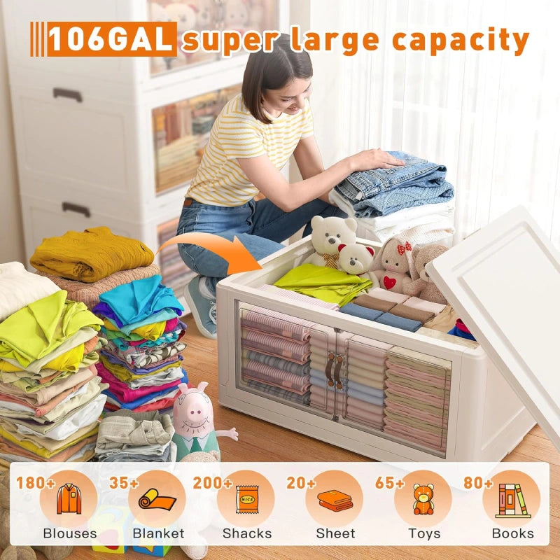 Stackable Use & Foldable UseThe stackable storage bins design can save you a lot of storage space without taking up a lot of floor space.You can use only one or stack multiple ones for use, which is very convenient. There are buckles on both sides of the top of each layer, which can firmly lock the wardrobe organizer on each layer without worrying about falling.When the storage bins is not in use, you can fold it and place it under the bed or cupboard to save your storage space.Extra Large Storage SpaceOur storage bins have a large storage space and can easily accommodate your clothes, sundries and other items.The translucent design makes it easy for you to find the corresponding items quickly.Two Ways to Openthe DoorThe stackable storage bins has two opening methods. You can open it from the top door and the front door respectively to store and take out your items.Stackable storage bins open front have magnetic lock buckles can prevent dust from entering the cabinetDurable, Healthy&High QualityMaterialMade of high-quality, healthy and thickened plastic, it is waterproof and durable. It has a longer service life than other plastic storage bins and can be used in bedrooms, living rooms, dormitories, etc.Removable Wheels & Easy InstallationThe bottom of the stackable storage bins is equipped with 4 detachable wheels, which makes it easy for you to move the storage bins. It is also very convenient when cleaning, keeping your room tidy.The storage bins has a simple design and structure, and you can easily install it in less than a minute.Specification:BrandRaybeeColorTranslucent Grey DoorMaterialDurable, Healthy PlasticSpecial FeatureSingle use, Lightweight, Stackable, Collapsible, WheeledStyleModernInstallation Manual 1(4 Packages): 55SCLSBLA24PJM-DLInstallation Manual 2(3 Packages): 55SCLSBLA23PJM-DL.