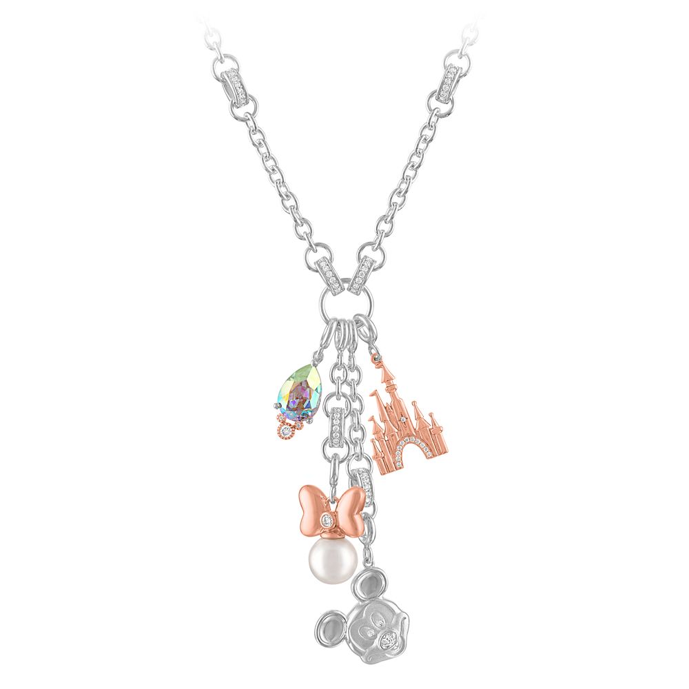 Choose how you want to sparkle with this elegant necklace set by Rebecca Hook. It includes a chain necklace decorated with cubic zirconia stones and four pendants to choose from including a sterling silver Mickey, faux pearl Minnie Mouse icon with bow, rose gold Fantasyland castle and teardrop Swarovski ''Aurora Borealis'' stone. Mix and match to personalize your look!.