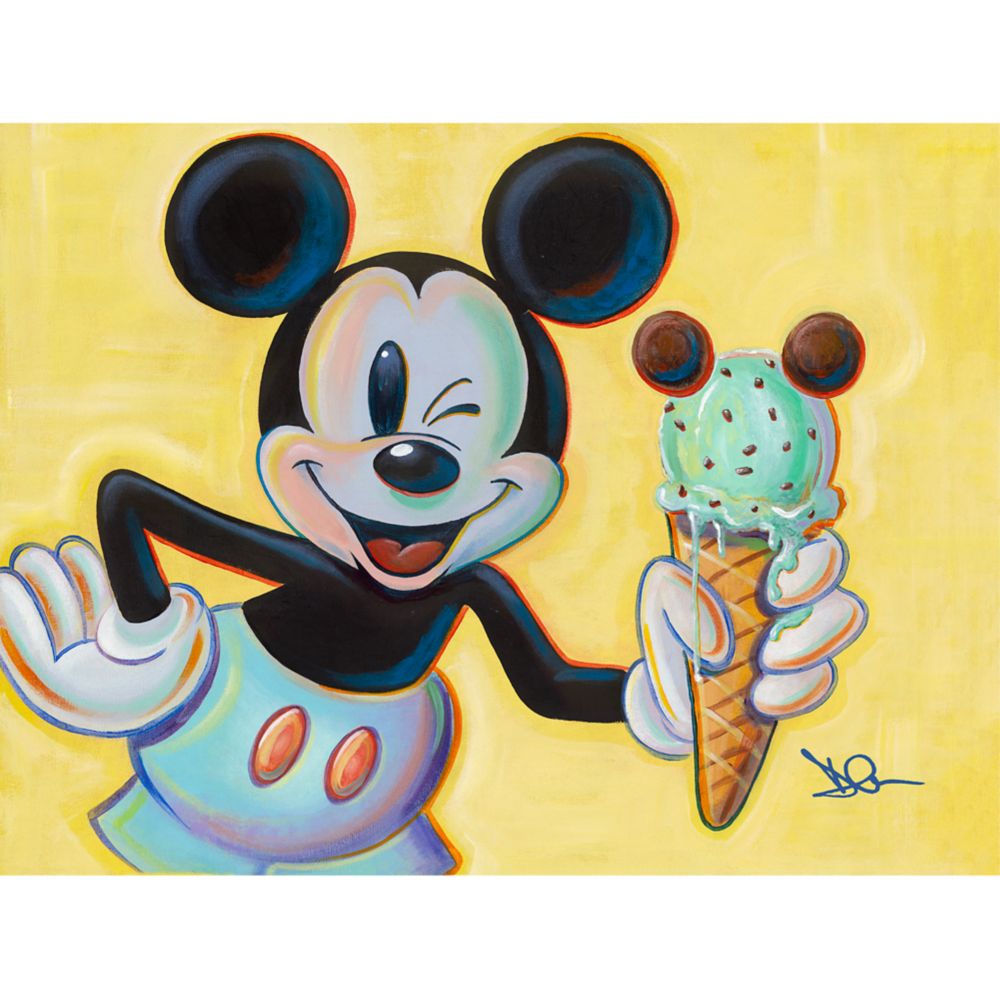 Everyone who's sweet on Mickey will have a taste for this colorful canvas artwork by Dom Corona. ''Minty Mouse'' features a smiling Mickey clutching a delicious looking mint chocolate chip ice cream cone decorated with two Mickey ears. This limited-edition giclée canvas print is gallery wrapped so it is ready to hang in your home.