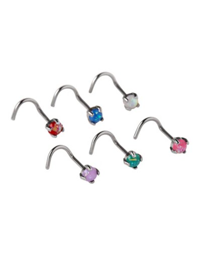 Includes: 6 Nose rings Piercing type: Nose Material: 316L Surgical steel Accent Material: Metal alloy Gauge: 20 Gauge Length: 6.5mm Stone Type: Faux opal Threading Type: External Threaded closure Care: Clean with antibacterial soap and warm water or saline solution Imported Note: Do not use rubbing alcohol to clean jewelry. Surgical steel may contain trace amounts of nickel.