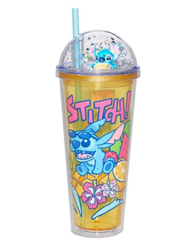 Make a statement with each sip when you use this officially licensed Lilo & Stitch Dome Lid Cup with Straw! This glittering cup is perfect for Disney fans in search of a little extra sparkle. Officially licensed Includes: Cup Lid Straw Dimensions: 11.2" H x 4.1" W x 2.6" D Material: AS Plastic, polyvinyl chloride, paper Capacity: oz. Care: Dishwasher and microwave safe Imported.