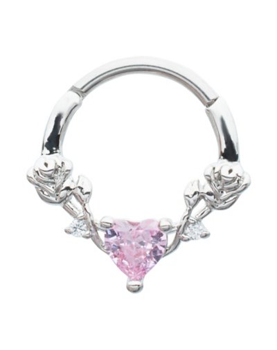 Pink Heart CZ Rose Hinged Septum Ring - Gauge