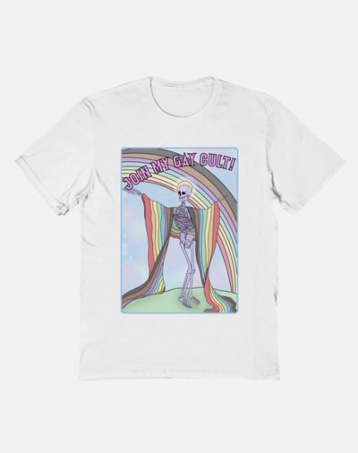 Calling all gay cult members! This officially licensed tee from Abprallen features a chill gay skeleton, hanging out with a pride flag. Officially Licensed Crewneck Short sleeves Material: Cotton Care: Machine wash; tumble dry low Imported This shirt is Unisex Sizing only For a fitted look, order one size smaller than your normal size Note: This item is print to order and may have a 1 to 2 day exra processing time.