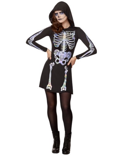 Have you ever seen such an adorable skeleton? This Adult Skeleton Hooded Plus Size Dress features long sleeves, a fit and flare design, and a bone-chilling skeletal print for a look that's both stylish and spooky. This skeleton dress is perfect for when you want to look good and feel bad to the bone! Includes: Hooded dress Material: Polyester, spandex Care: Spot clean Imported Note: Shoes, makeup, and stockings sold separately.