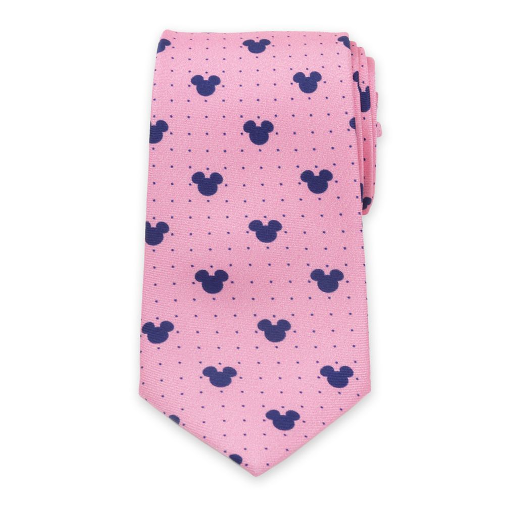 It's time to bring some color and fun to your wardrobe with this silk tie. Deep navy Mickey Mouse icons and pin dots have been set against a rich pink background, making it perfect for brightening up the boardroom.
