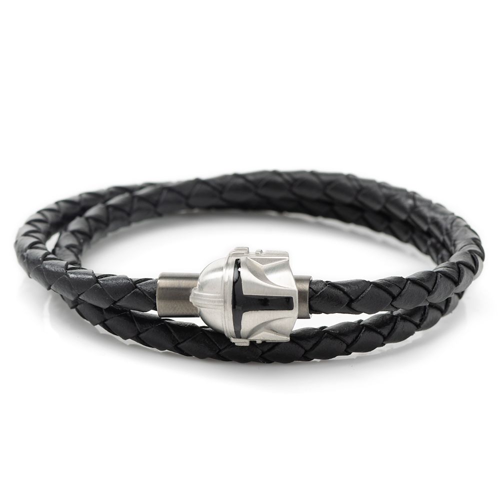 Fans of Star Wars: The Mandalorian on Disney+ will put a bounty on this cool bracelet. Inspired by The Mandalorian's iconic helmet, this braided black leather and stainless steel double-wrapped bracelet features a magnetic closure in the helmet.