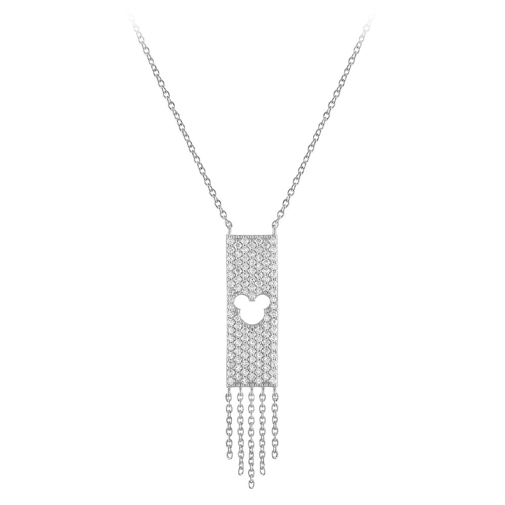 Pavé set cubic zirconia cover the rectangular pendant of this elegant necklace by Rebecca Hook. Created in sterling silver, it features a Mickey icon cut out and dangling chain details for a piece with dazzling style.