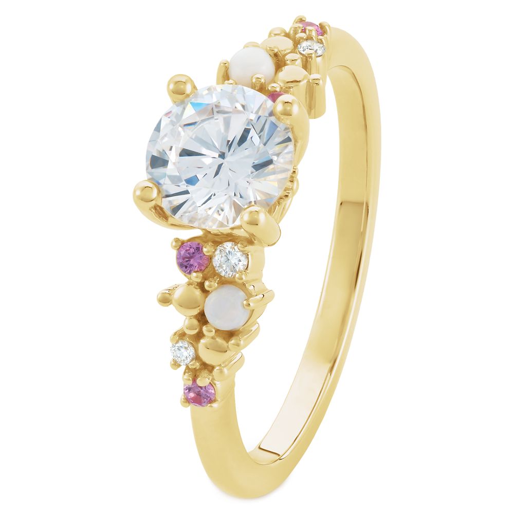 Transform a special event into a fairytale occasion with this truly dazzling engagement ring. A magnificent 1 carat diamond is surrounded by diamonds, pink sapphires and opals, all beautifully set on a 14K yellow gold band. Created in celebration of the 30th anniversary of Disney's Fairy Tale Weddings Collection, it will provide romantic memories happily ever after.