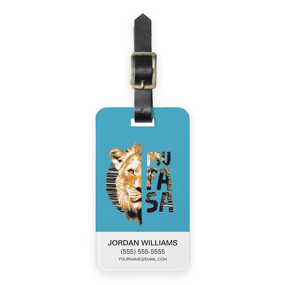 The face of the regal Mufasa is featured in the bold typographical design on this customizable luggage tag inspired by Disney's computer animated adventure Mufasa: The Lion King.