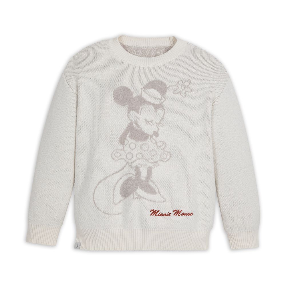 A vintage-era Minnie Mouse is pictured in a bashful pose on the front of this kids' knit sweater from Barefoot Dreams. The intarsia design features a subtle fluffy Minnie image woven into the cream crew neck pullover. Her ''signature'' is embroidered in red on this blended cotton top that features a ribbed hem and cuffs.