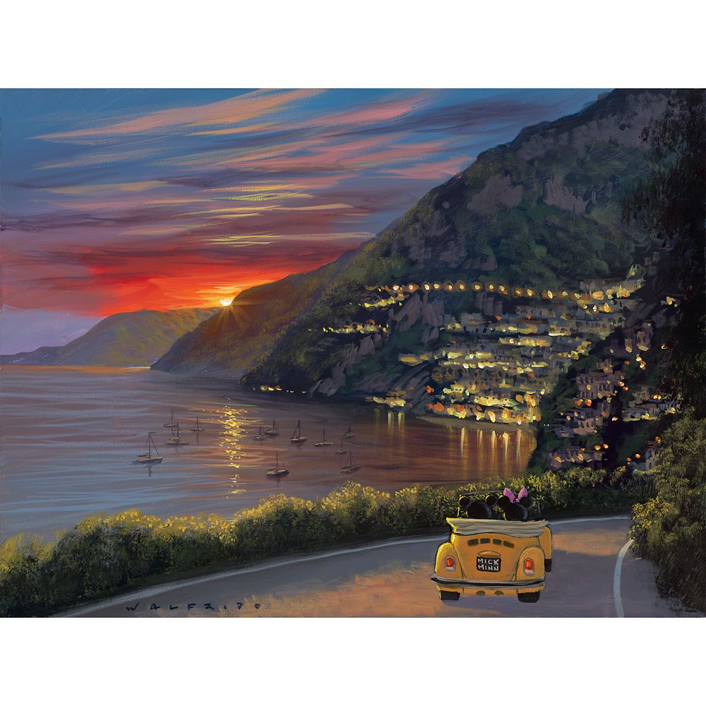 Mickey and Minnie enjoy a sunset drive along the stunning Italian coast in this charming artwork by Walfrido Garcia. ''Riding Through Amalfi'' is a limited edition print that comes gallery wrapped on canvas and ready to hang in your own piece of paradise!.