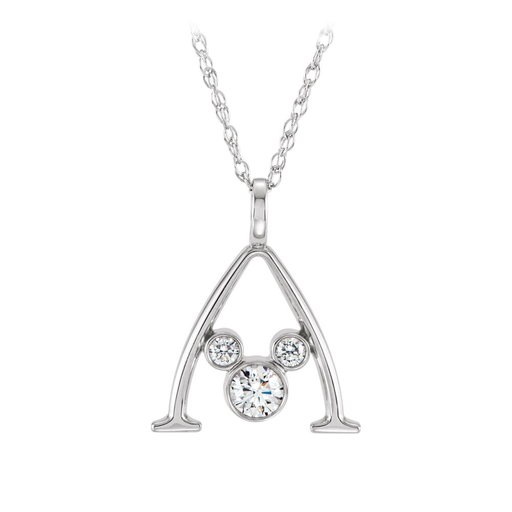 Mickey Mouse will bring back sparkling memories of your exotic vacation to Aulani, A Disney Resort & Spa. His iconic likeness is crafted with diamonds and framed within the gold ''A'' pendant of this elegant necklace.