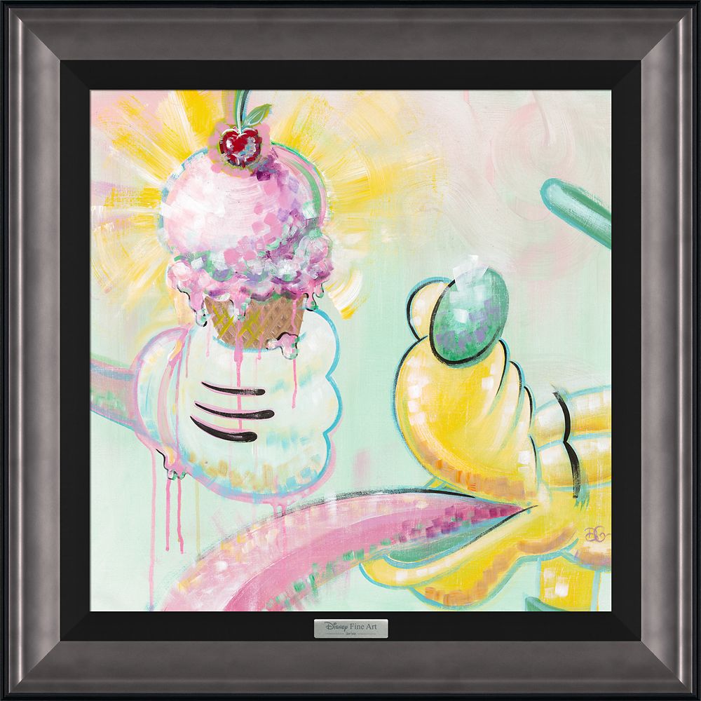 Pluto sticks out his tongue in hopes of catching some drips of Mickey's ice cream in this mouth-watering canvas artwork by Dom Corona. Part of the Disney Fine Art Silver Series, ''Pluto's Pup Cup'' is presented as a limited edition canvas print in an elegant frame with a fabric liner and aluminum plaque so it's ready to hang in your home.
