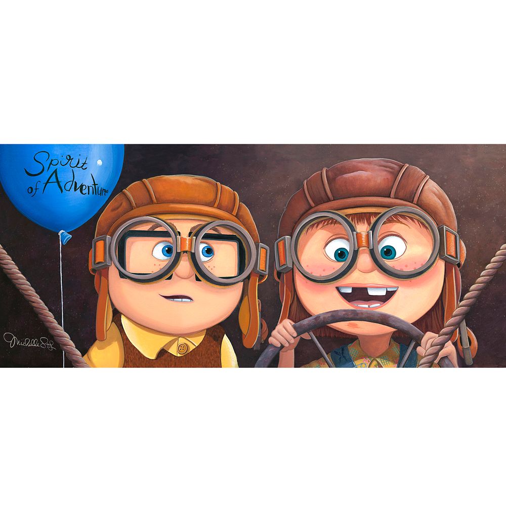 The young Ellie and Carl playfully act out one of the exciting trips they plan to go on together when they're older in this delightful work by Michelle St.Laurent. Inspired by Disney and Pixar's Up, the limited edition ''Adventure Awaits'' comes gallery wrapped on canvas and is hand signed by the artist and individually hand-numbered.