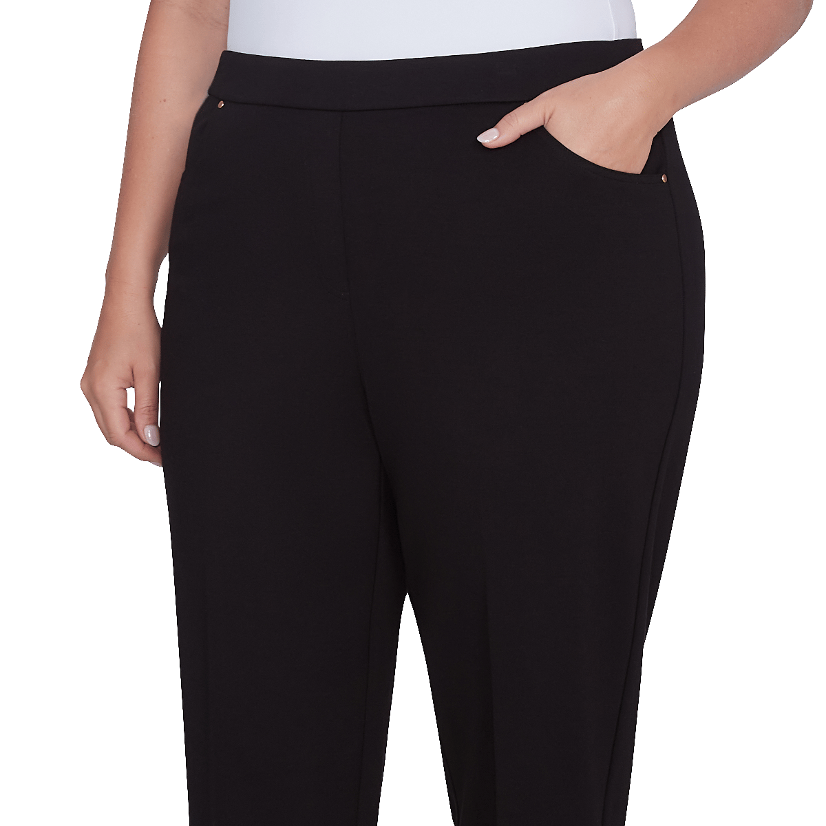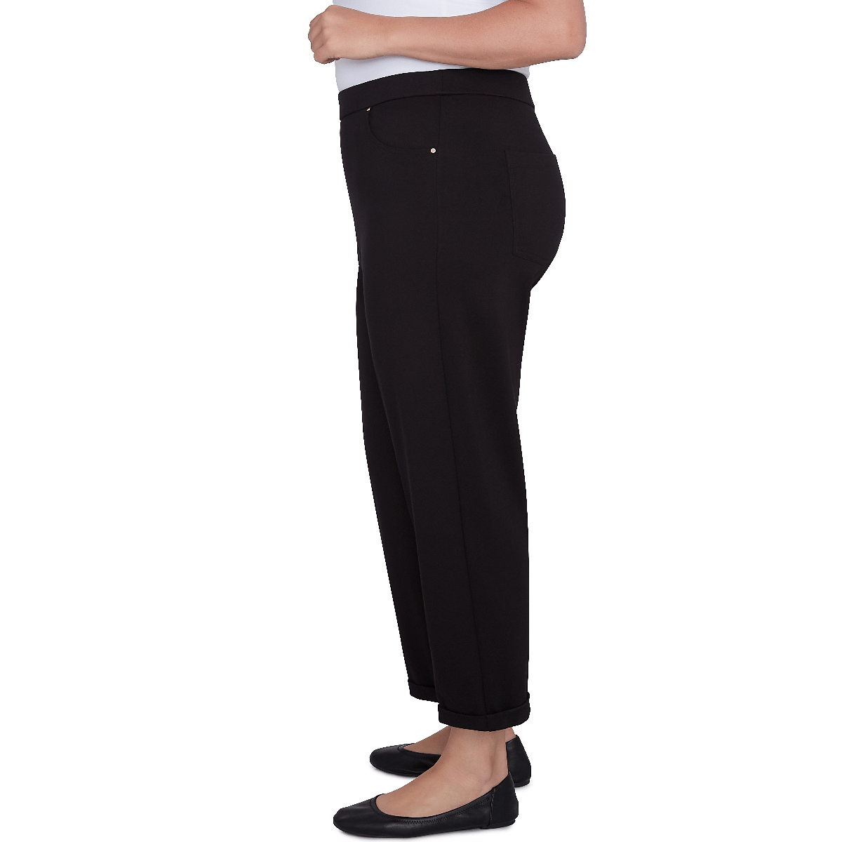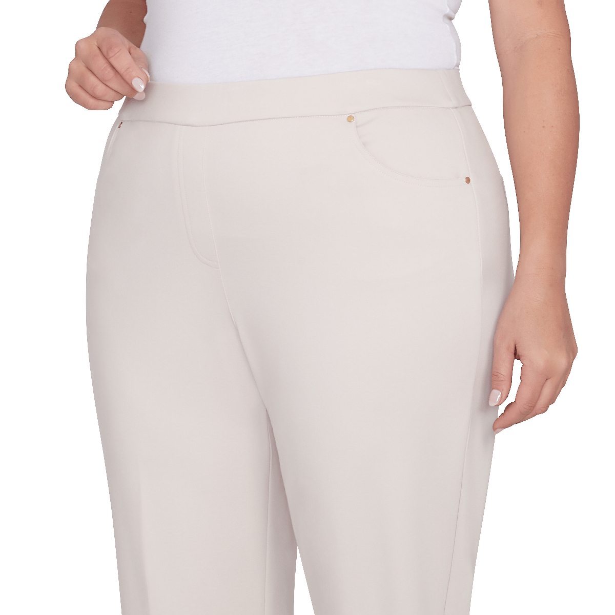 Collection: Romancing The Stone Pattern: Solid Leg Style: Ankle Rise: High-Rise Fit: Regular Fit Contouring elastic waistband Four-pocket styling Faux fly stitch Rivet accents Rolled hems Pull-on.