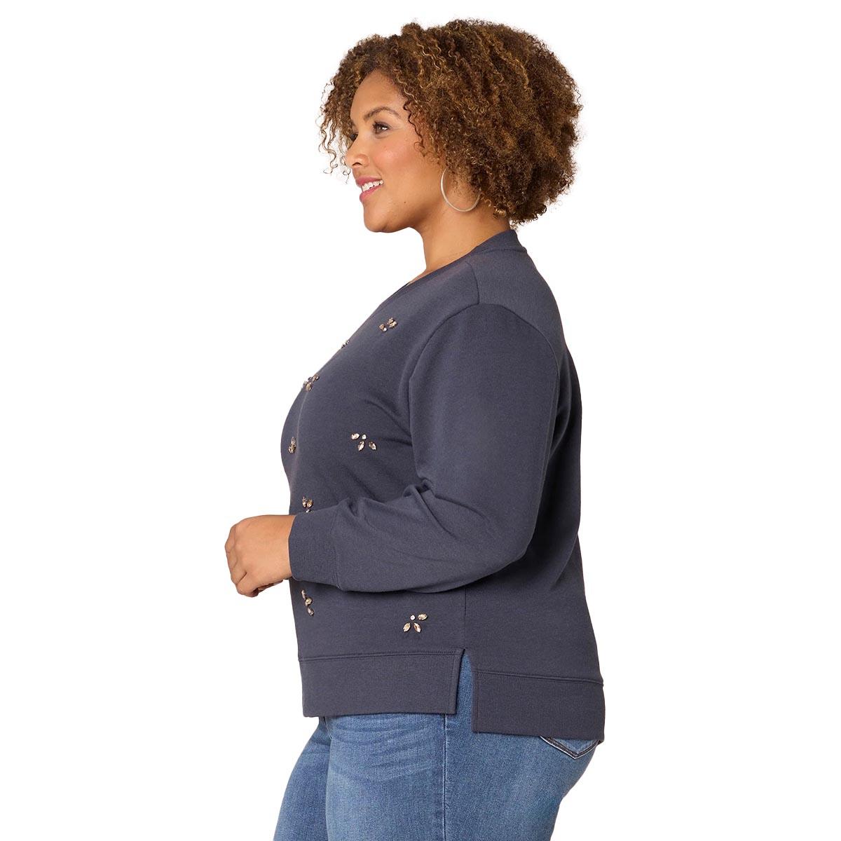 Pattern: Solid Sleeve Length: Long Sleeve Neck: Crew Neck Drop shoulder feature Rhinestone accented front Rib-knit banded neck, cuffs & hem French terry construction Split-step linear hem Cool iron on reverse.