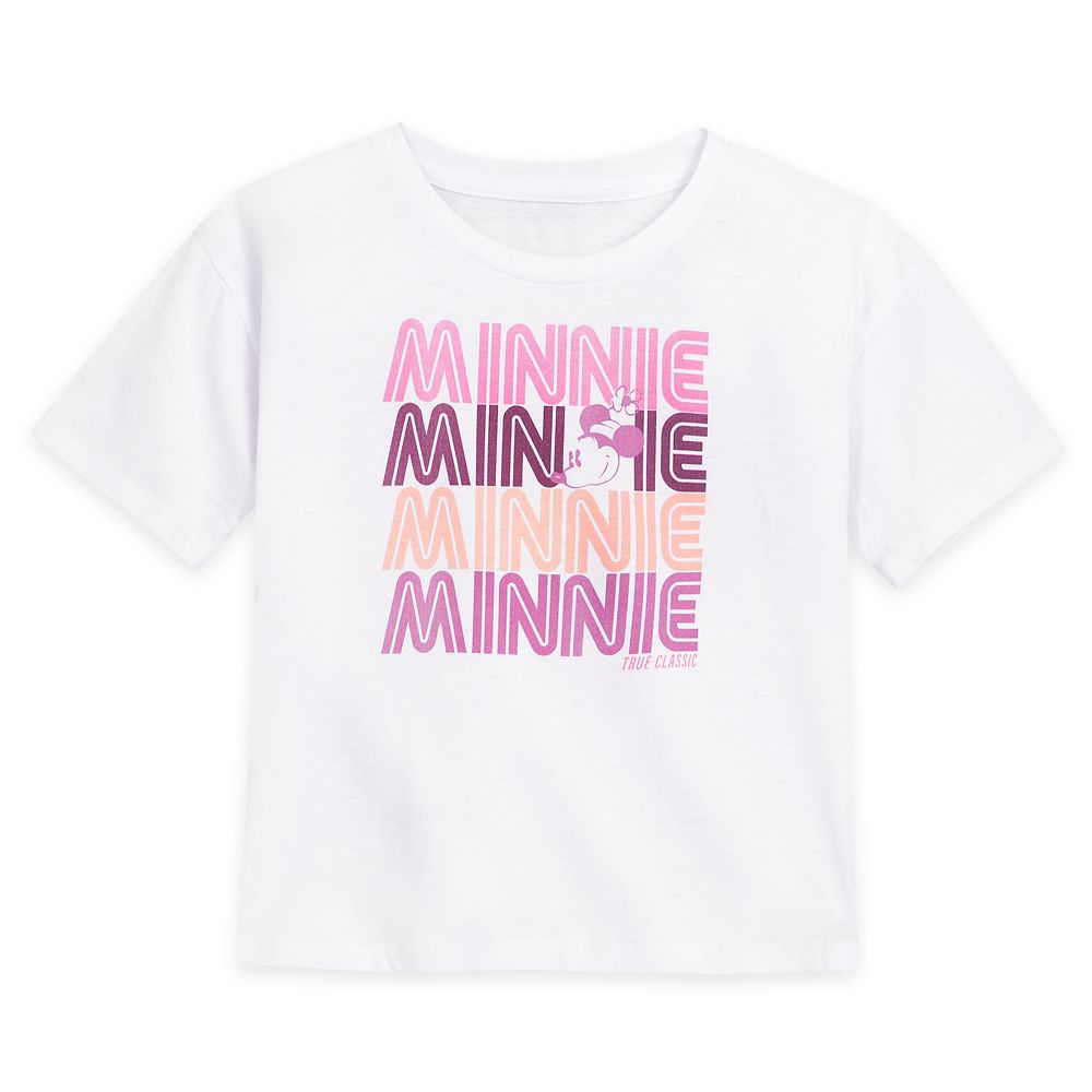 Superstar Minnie makes a big impression with her name repeated four times in different colors on this pop art graphic tee dedicated to the one and only, true classic original herself! Boxy fit with dropped shoulders and semi-cropped hem makes Minnie thoroughly modern.